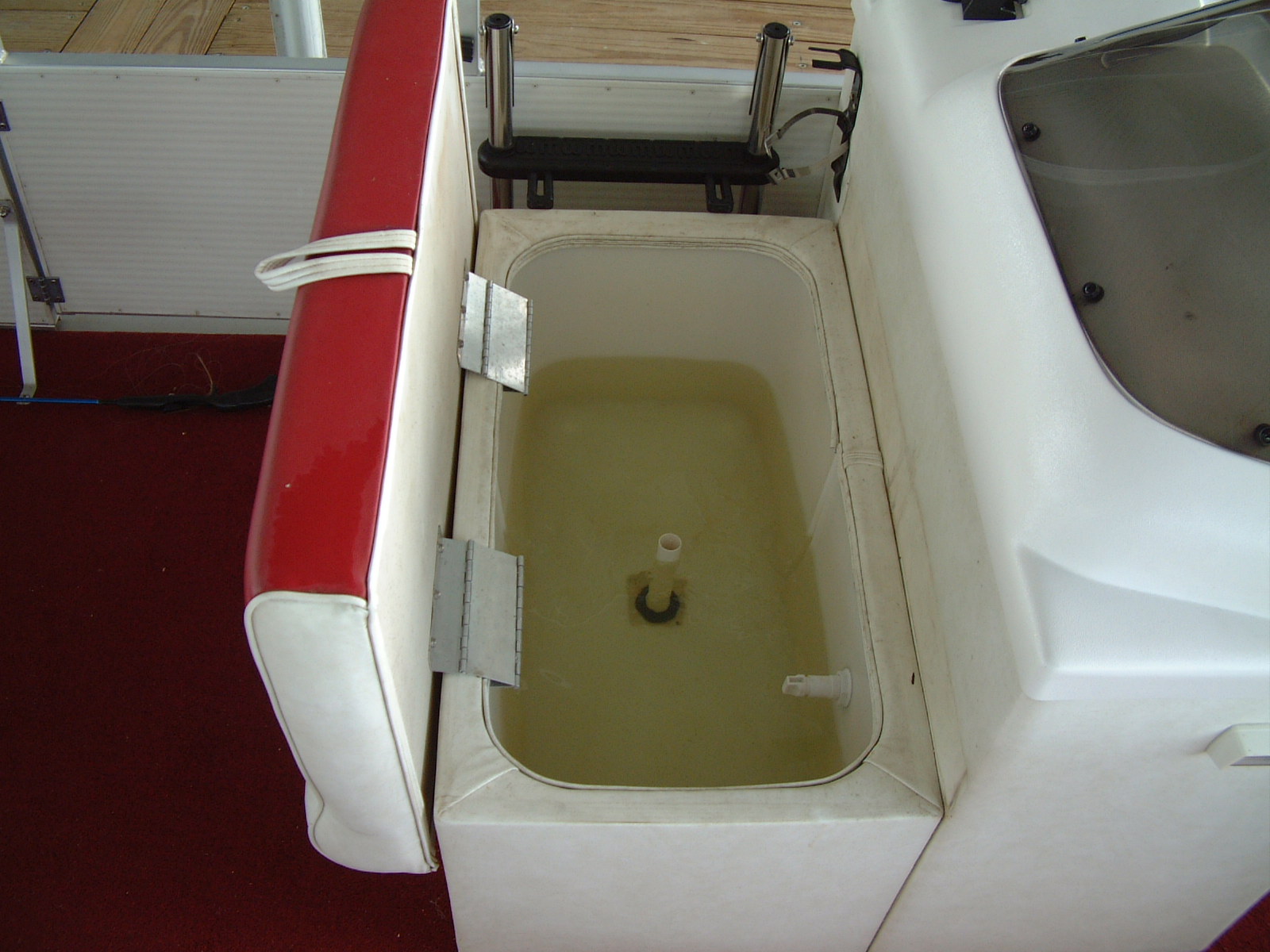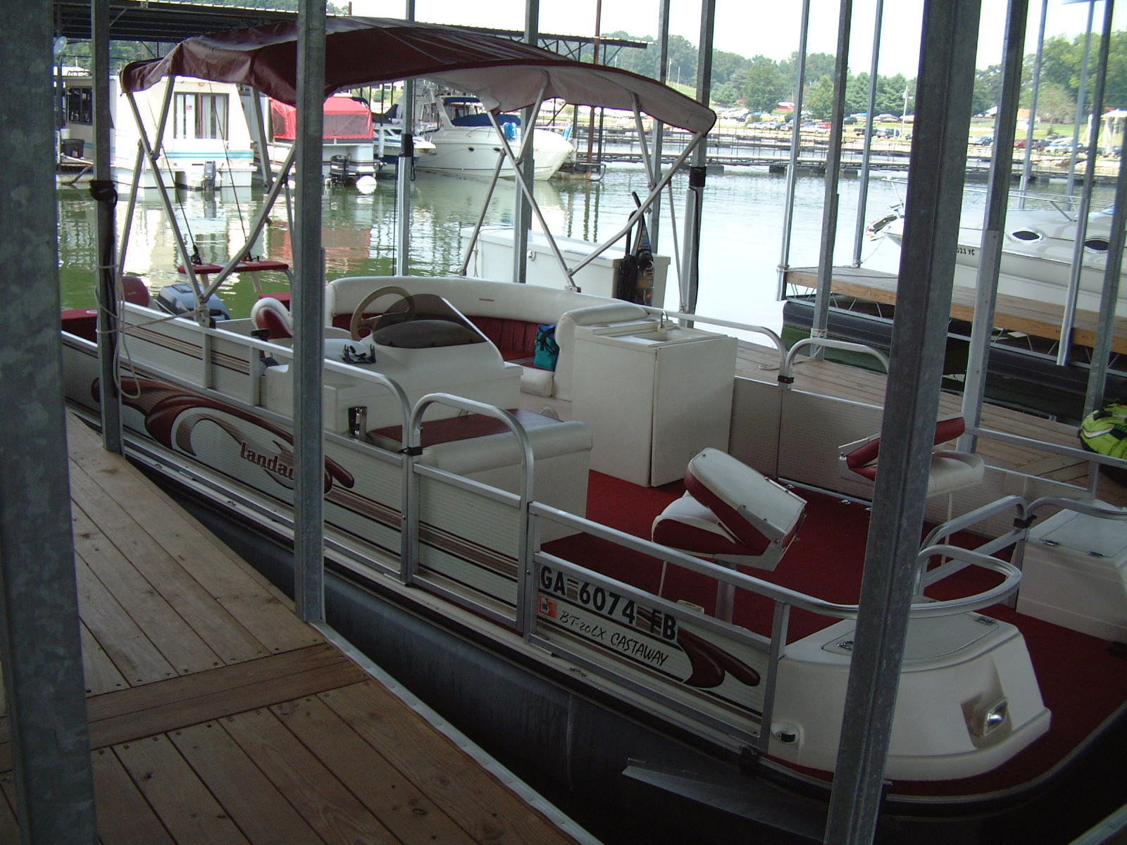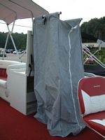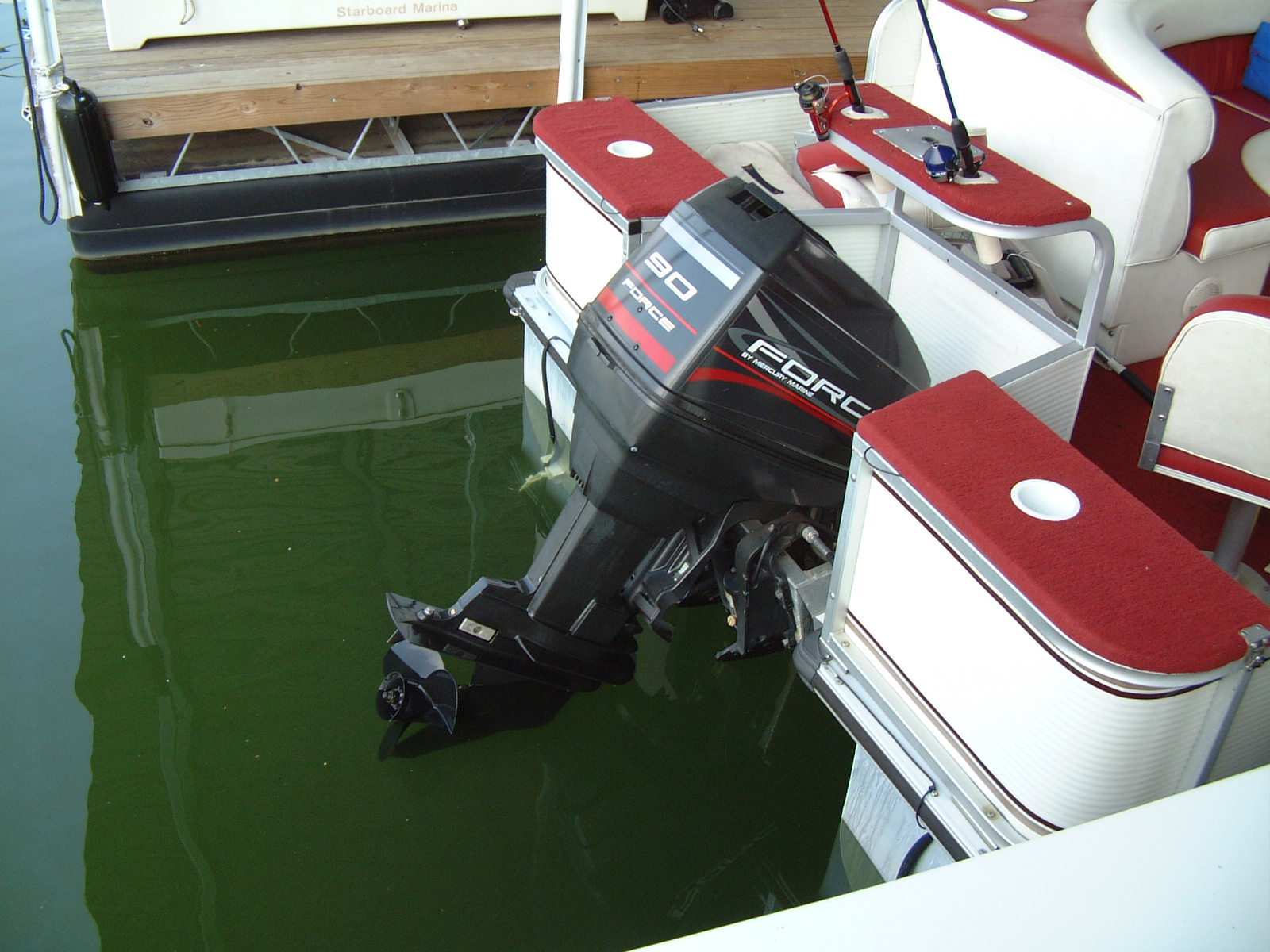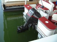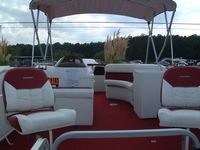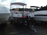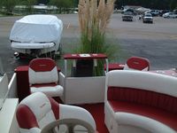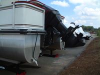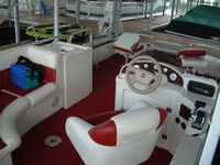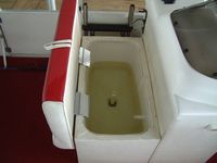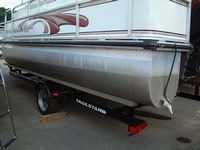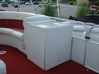 Here are some pictures of the best 20 foot pontoon/fishing boat out there, the two compartments at the front are a small live well and a cooler, the large live well is in front of the driver area. Water flow to the live wells are controlled by a toggle switch, the drain pipe can be removed to drain them entirely. I do not know how many hours are on this boat but looking at the physical condition of the prop alone would lead me to believe that it is not many, the prop is free of the scratches and paint loss that props suffer due to cavitation and use. The area under the sink is used to store the porta pottie and the collapsible changing area. The bimini top folds up and has a zip cover for storage, the boat also comes with a full mooring cover that covers the entire boat. The motor is a Force 90 hp 2 cycle by Mercury, it will get this boat to a top speed of 23 mph, fires right up and runs smoothly across all RPMs. For sound there are two marine speakers and an Alpine AM/FM/CD head unit. The mount you see on the drivers area in the pictures is for a Lowrance X22a depth guage and fish finder, great for locating all of the big fish. There is storage under the bench seat for a water tank to hook up to the sink and for life vests, anchors, ropes, etc. There is a rod/reel locker beside the drivers seat, this and the two rear compartments can be secured with padlocks. There is a detachable,fold up ladder that mounts to the floor beside the door, makes for ease of boarding for skiers/tubers/swimmers. The pontoons were just pressure-checked and are tight as a drum, boat is in fantastic shape. The trailer was just purchased as well and has not been registered yet, it is the deluxe trailer with tongue brakes and the breakaway braking safety feature, tows quite easily. Thanks for looking :-) Click on any of the thumbnails below to see a larger picture: