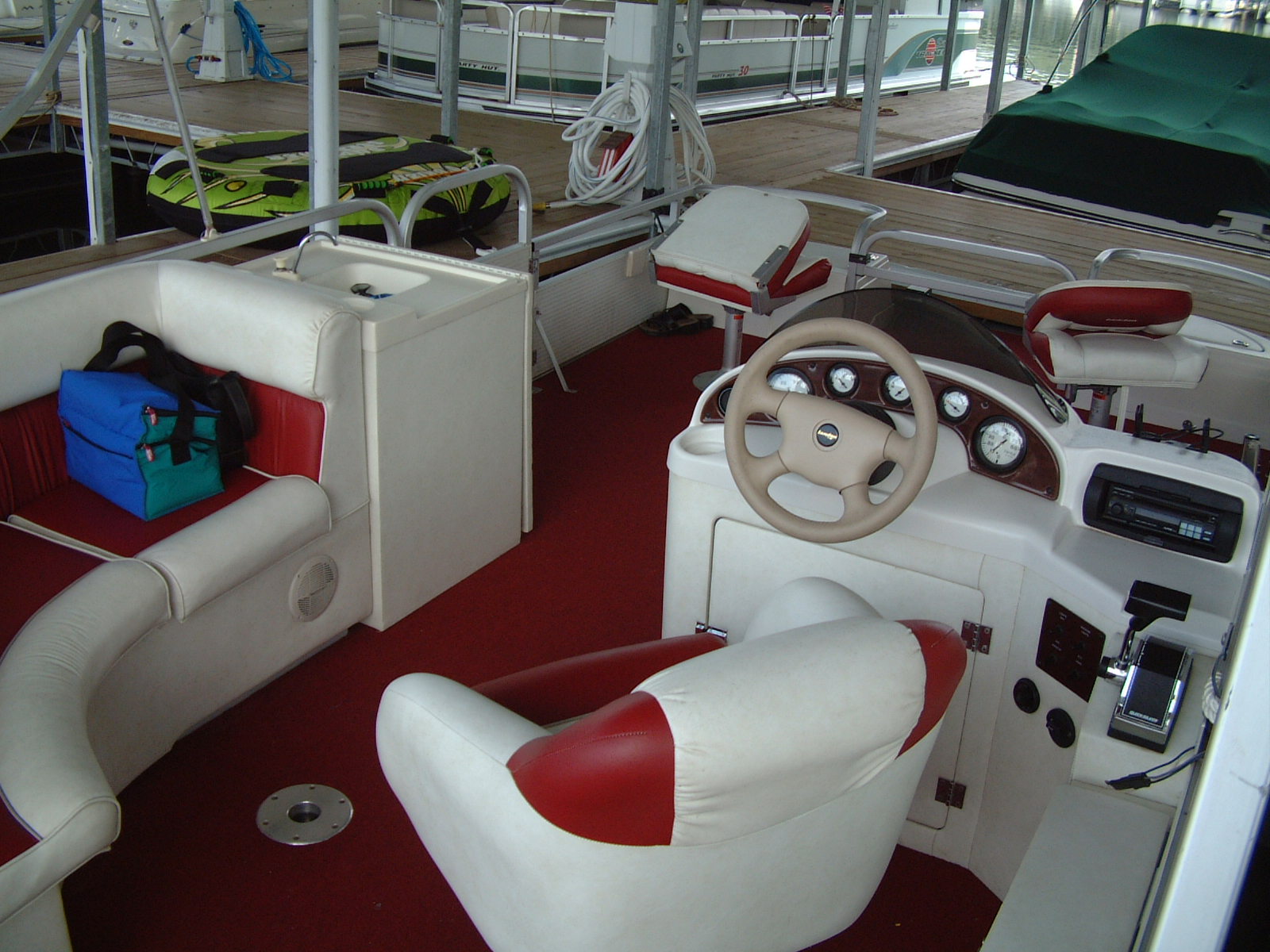 The story behind the boat......purchased the boat in the summer of 2003 so the family could go out on the lake. I also had a buddy with a cruiser and this pontoon boat would serve as transport for camping/day supplies for us to set up on the beach. They say boats are a hole you can pour money into and this could have turned out like that, but I enjoyed it for the summer months and sold it in the fall for what I payed for it so it was free fun :-) Here is the ad I used to sell it, nice boat but I got tired of having to tow it, if I ever do the boat thing again I will have a slip at the marina.....