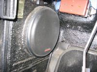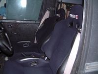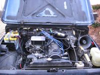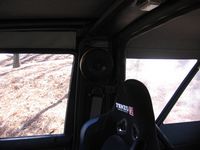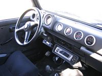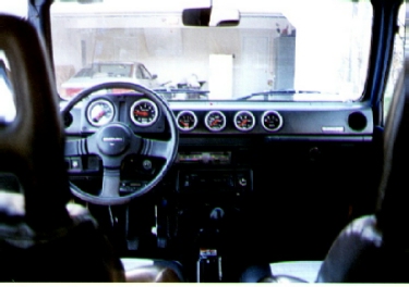 The first thing to go were the guages. I bought all AUTOMETER guages (speedo,tach,oil,water,fuel,voltage) and with a little cutting, fabrication, and re-wiring put them in. They look a whole lot better and provide a more accurate indicator of what is going on with the motor. Replaced the high beam and 4x4 indicator lights with super bright LEDs mounted in the bottom center of the main guage cluster. I didn't plan on a body lift so the stick got cut next, topped with a MOMO shifter. NOW, I don't feel like I'm driving a school bus. After these pictures were taken I replaced the steering wheel with a Momo and put some non-slip aluminum pedals in. The mods to soon follow were a CD player, Fosgate amp and 6.5" speakers in the factory holes and in the side targa panels (custom mounted), CB, Weber carb, K&N air filter, Thorley header, 2" exhaust with hollowed out cat., 15"x7" aluminum wheels (ordered and left at NTW by somebody so the guy let me have them for $60 each), 29" x 10.5" Thornbirds, Calmini shackle reversal (so it would clear the Thornbirds), Pro-Comp Explorer shocks and steering stabilizer, poly bushings, and two new soft tops (unhappy with Bestop so I bought the Kayline, major improvement).
