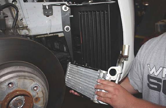 the OEM oil cooler by loosening the tab inside the oil cooler air vent and