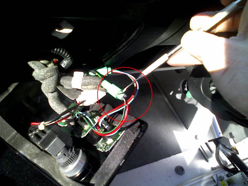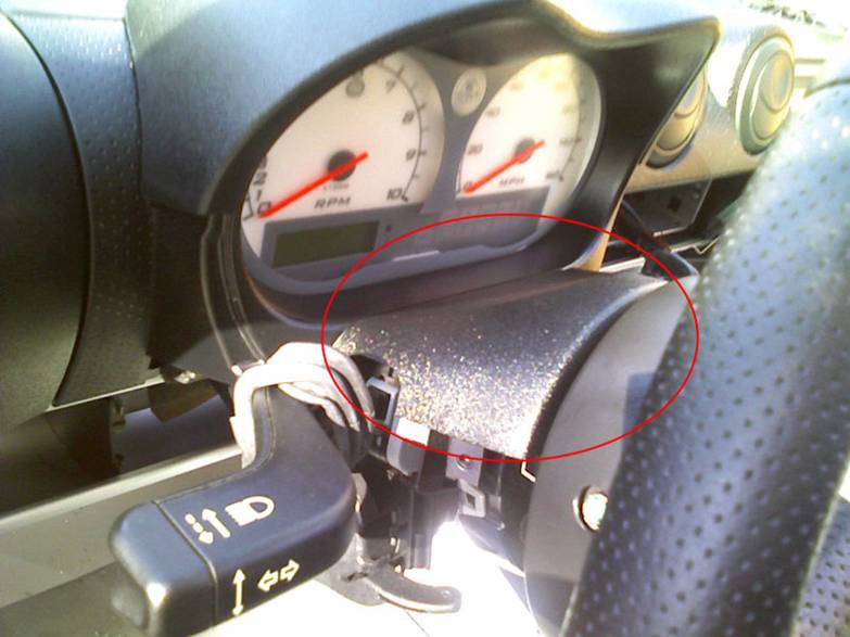 Pull the bottom part downwards and disconnect the trip reset button cable. A small pick or eyeglasses screwdriver inserted into the clip will release it.