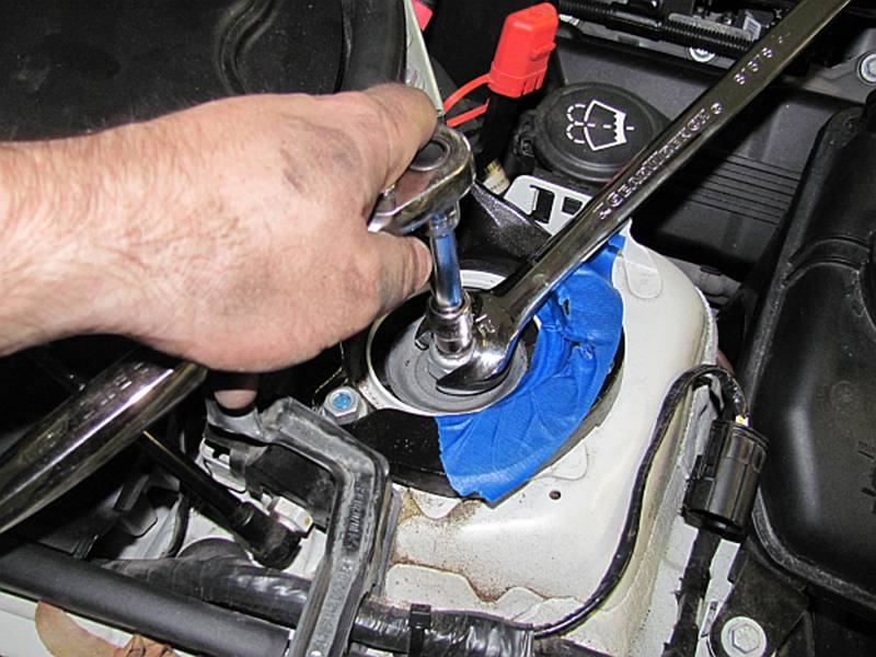 socket wrench and 21mm wrench are again used on top to completely remove the