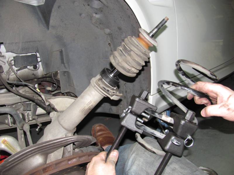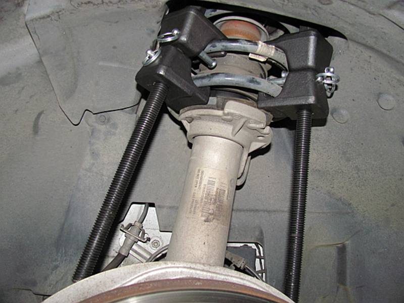 compressed the spring by placing a jack under the lower ball joint and jacking: