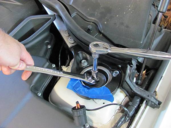 using a 10mm socket wrench to hold the strut piston rod and a 21mm wrench to