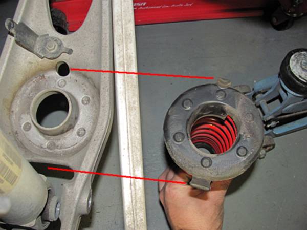 smaller tab fits through a hole in the control arm and the larger tab fits the