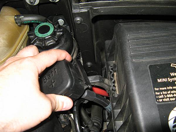 battery terminal will need to be lifted up and over the retainer slot to