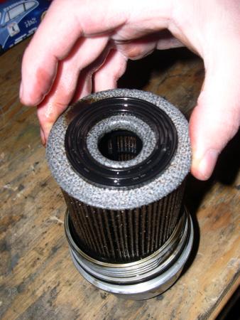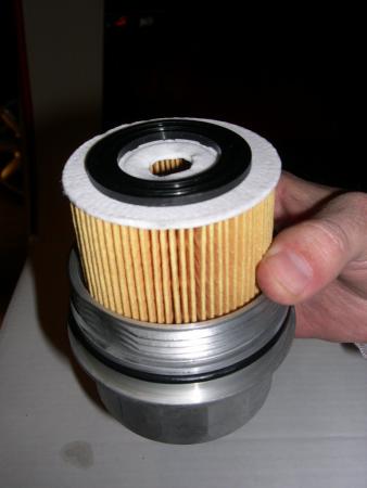 9. Reinstall the filter on the block. You will need to push the filter onto the guide - it sorta feels like it pops on. Screw the housing back on, and torque it to 25Nm, which isn't that much more than hand tight.