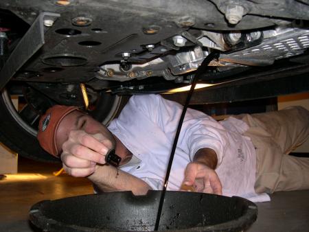 When you pull the filter off, it's tough to keep oil from getting everywhere, but moving the drain pan about six inches more toward the passenger side from where it was for the case drain plug will minimize the mess.