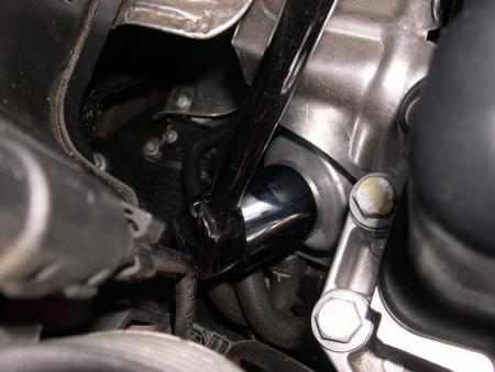 4. Let the oil drain, and move to the top of the car. The filter is a canister type on the backside of the block to the passenger side of the center. It is removed using either a 36mm wrench (some of the larger adjustables will get this big as well) or a 36mm socket and ratchet.