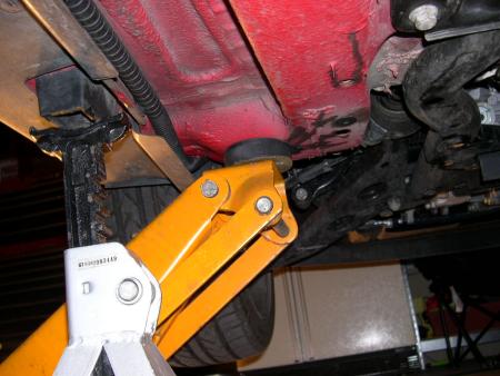 2. Jack up the car, and use jack stands (for you 2minis). Here is the best jack point we've been able to find. It will lift the entire side, so you can put the jack stands under the factory jack points. This picture is looking forward on the driver side.