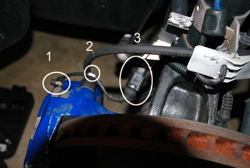 (#2) has a hook on it to hold the brake sensor line in place, and the line is