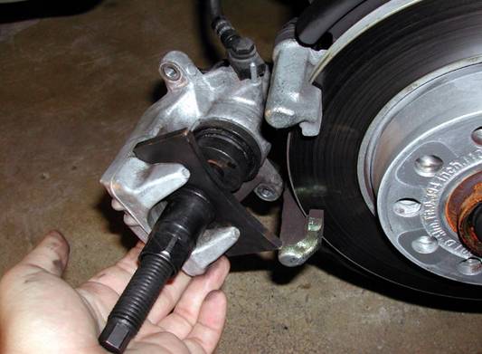 the bottom caliper bolt and the caliper will slide off. Now remove the back pad