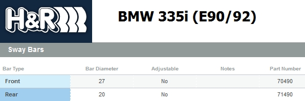 335i sport package swaybars are 26.5mm (F) and 13mm (R). The H&R bars are 27mm (F) and 20mm (R) and help to dial out the understeer. This is the FIRST thing