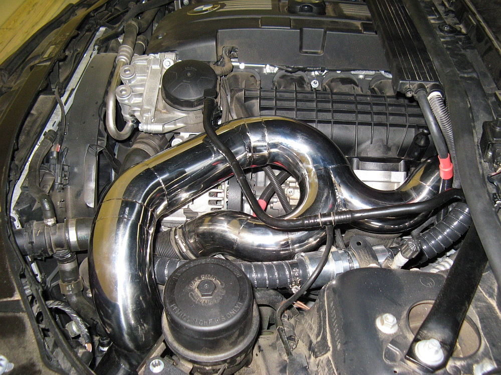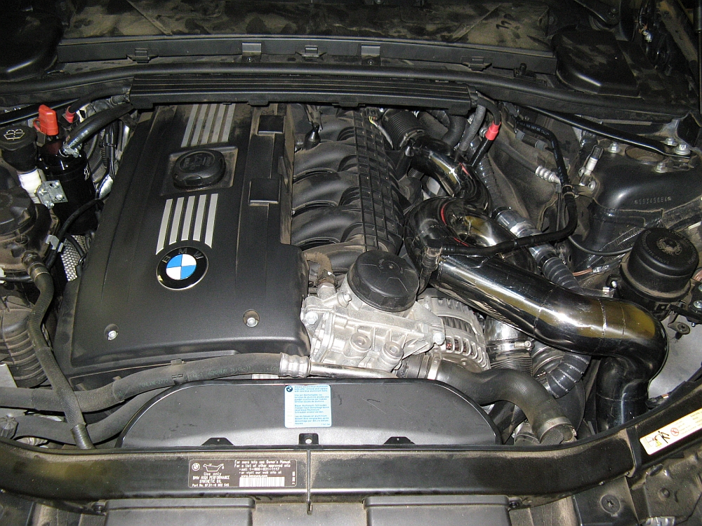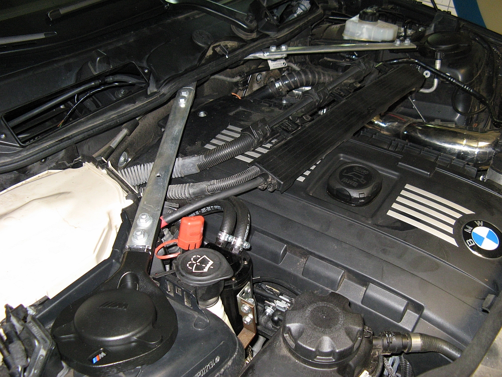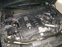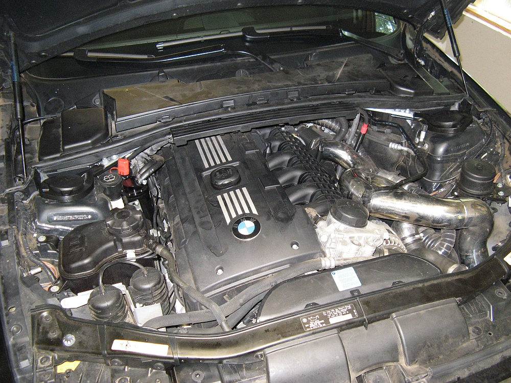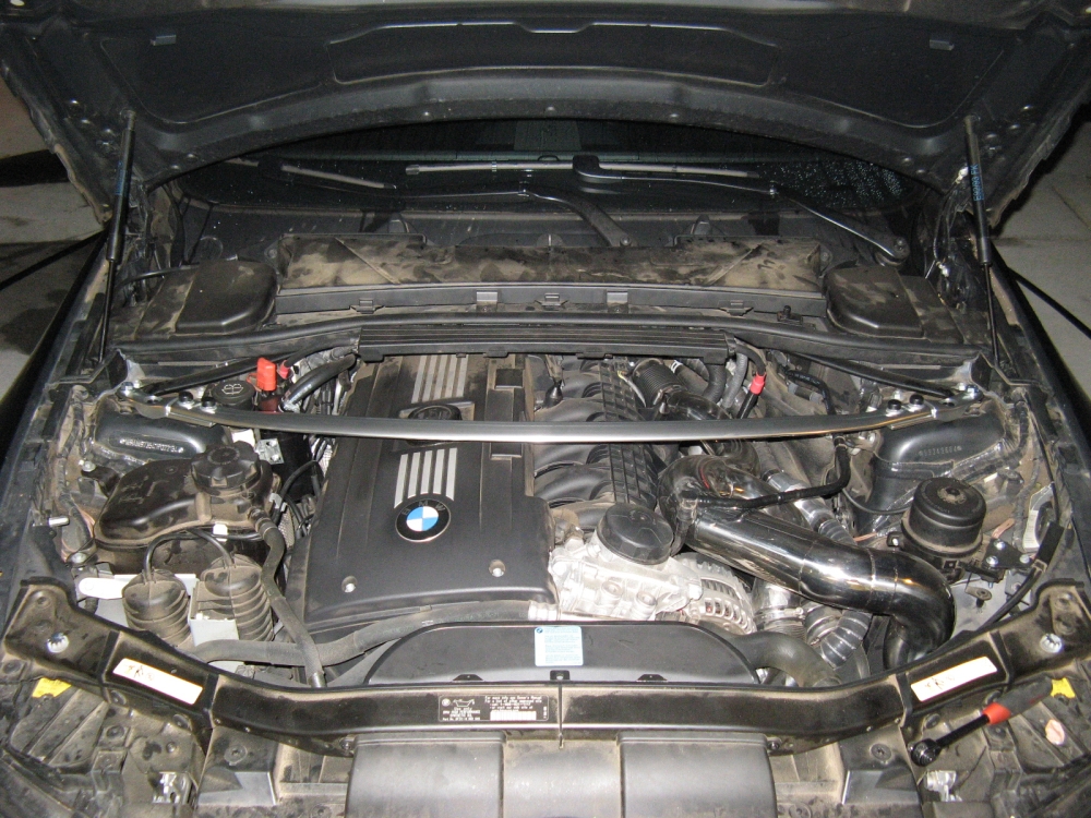 This brace will not fit a 335i with the OE airbox due to interference, some have had luck shimming the bar with washers to clear the OE airbox. Since my OE airbox