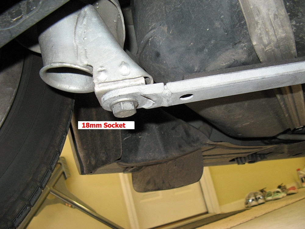 I started the installation by backing the car up on Rhino Ramps and chocking the front wheels. Removing the brace involves removing the two rear bolts on either side (18mm socket)