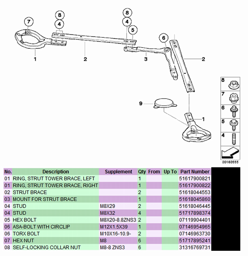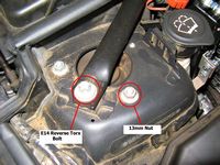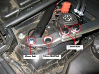 is history, the brace fit fine with no issues. Two bolts and two nuts are removed (mine were E14 Reverse Torx and 13mm Hex Head) from both strut towers, one of each