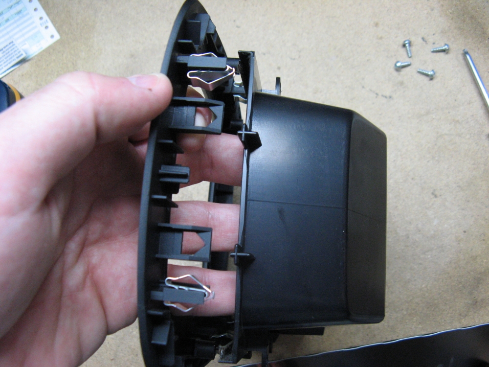be disassembled by removing 4 T20 Torx head screws and sliding the lower section out of the two locating holes in front.