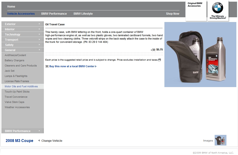 the promotional video HERE. BMW Oil Travel Bag (P/N 83290144484) purchased to hold extra liter of oil in the trunk.