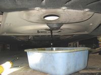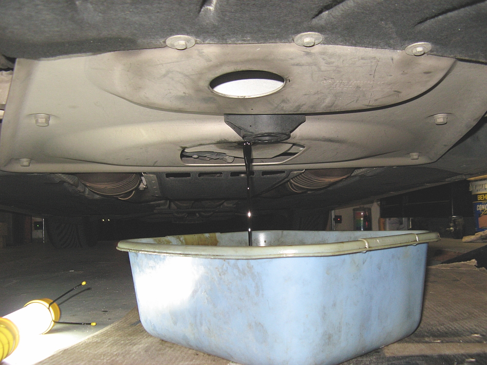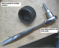 Drive the car up on ramps. Loosen the canister lid with the 36mm socket but don't remove it. Remove the oil filler cap. Remove the oil drain bolts one at a time and let drain