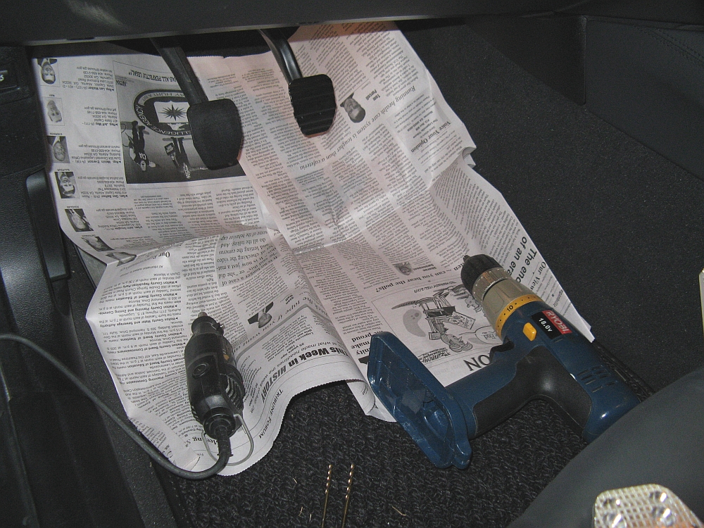 in the drill to drill a pilot hole and then the larger screw sized bit. Paper placed under the pedals allows for quick cleanup of the plastic and metal drill