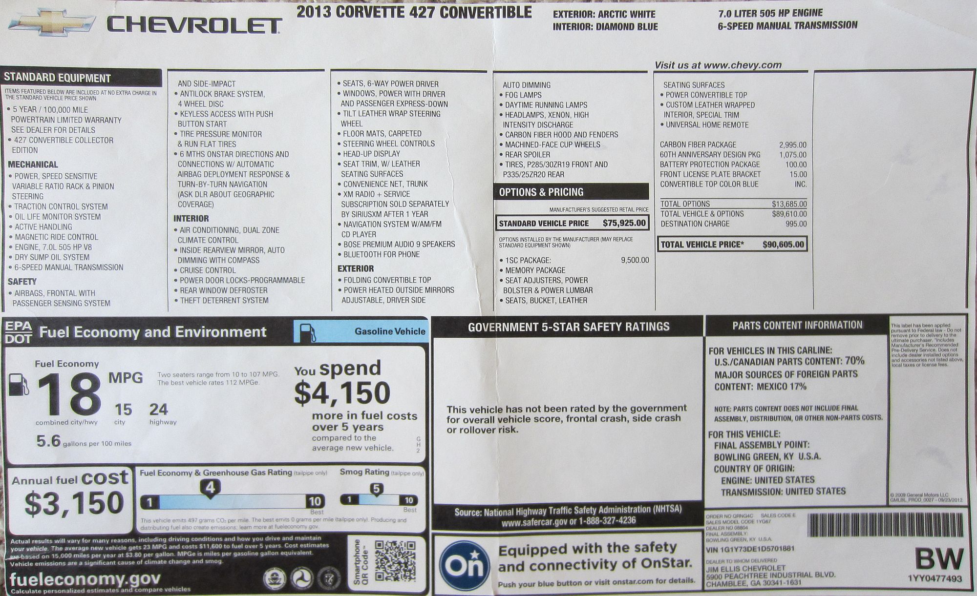 This 2013 Corvette 427 (1SC) was purchased new from Fred Gamble at Jim Ellis Chevrolet. This car was a 60th Anniversary Package car sans stripes with black wheels- exactly what I was looking for. My 2012 Grand Sport was returned to stock and traded in for this car. Fred and the Jim Ellis sales staff were great to work with and I would not hesitate to recommend them to anyone looking for a Corvette. That said, I made the mistake of not double checking all of the boxes in the car when I turned it in and left my iPod and 64GB flash drive in the center console, never to be recovered- draw your own conclusions. Window sticker is HERE.