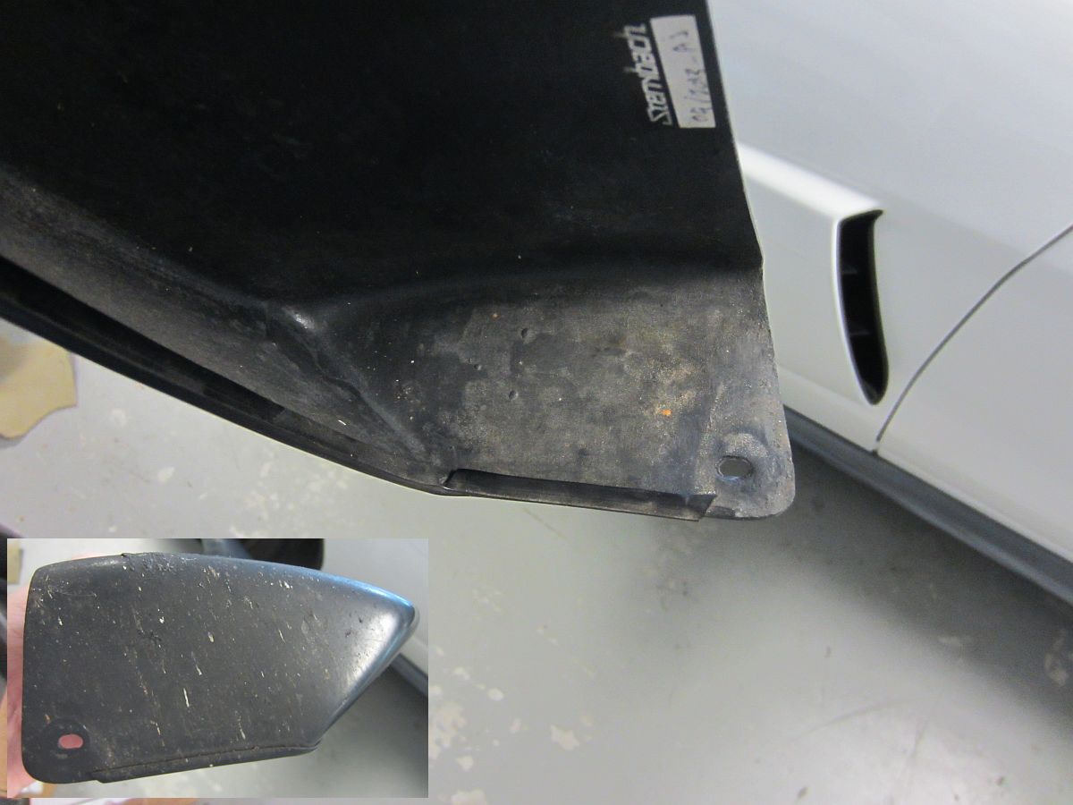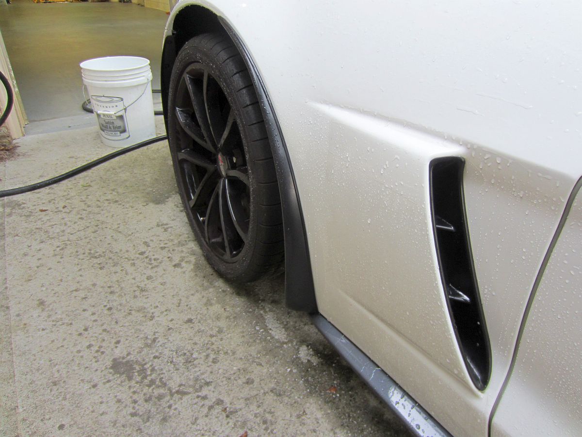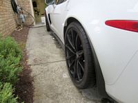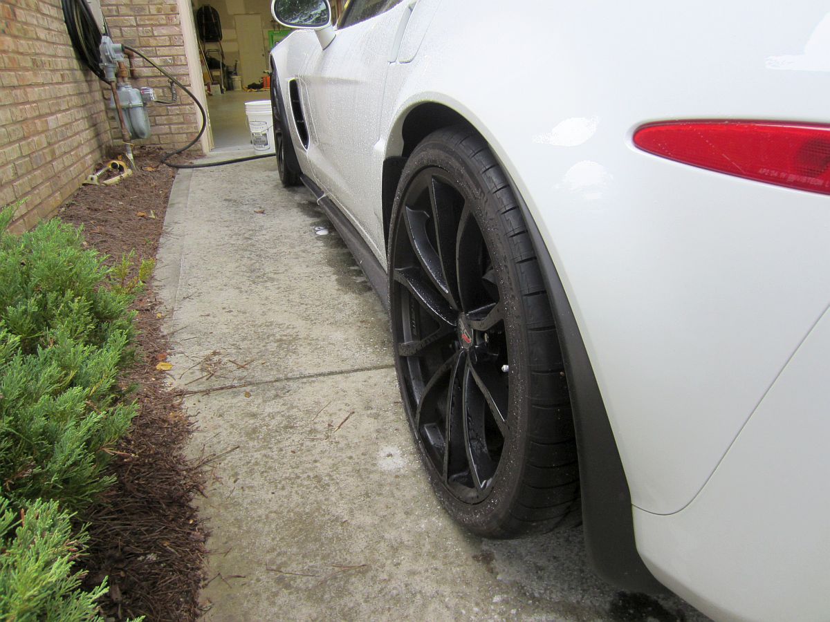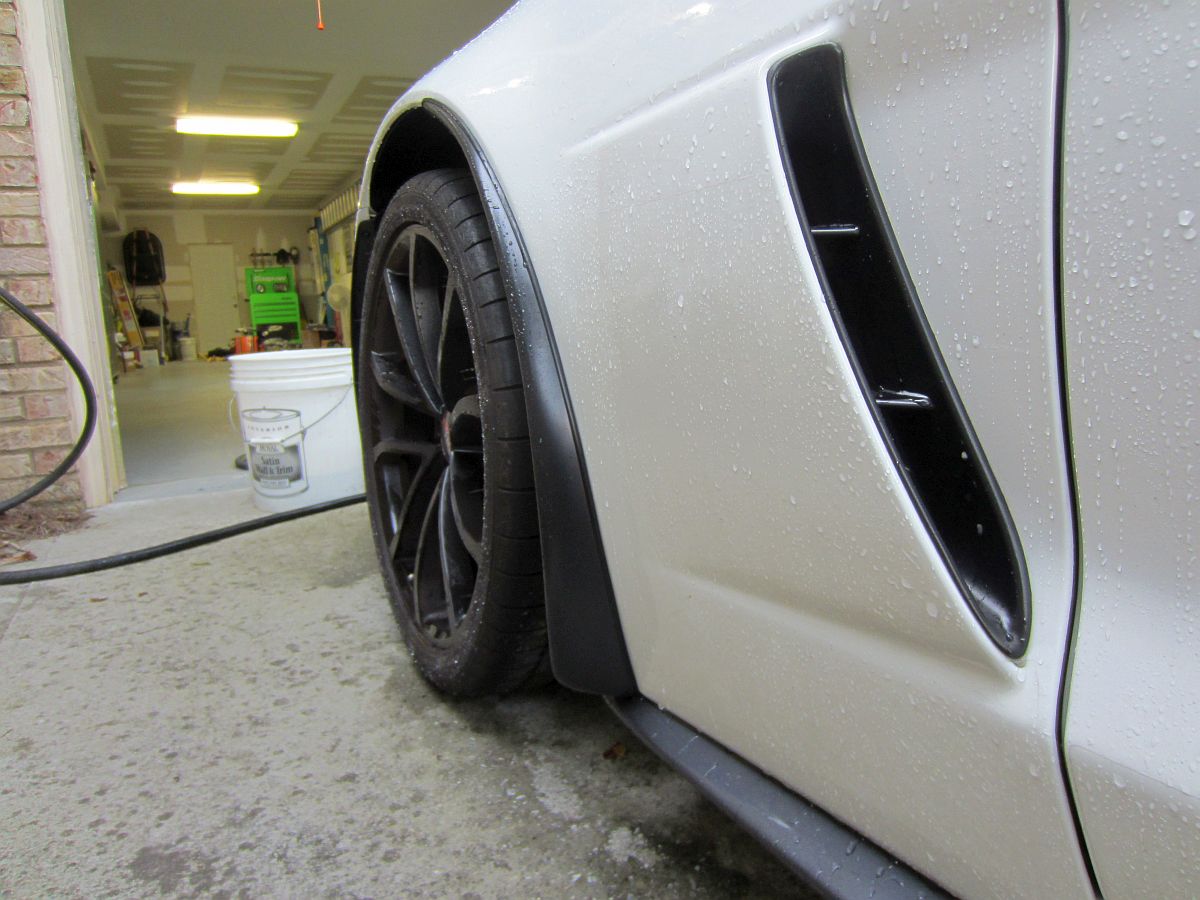 So, the question I had asked myself since buying the 427 with the carbon fiber skirts is this: should I try modifying the Apsis splash guards I already had to work with the skirts or sell them and buy new ones at additional cost to me. I decided modification was something I would attempt to save some money and because I was curious if it could be done without removing the side skirts. I had seen some posts of people that were able to use the normal Apsis splash guards during skirt installation but removing these skirts is painful, a lot of rivets have to be drilled out with no guarantees the skirts won't be damaged in the process. The key to all modifications is cut less than you think and fit accordingly by taking small amounts of material off by sanding....and I still took a bit too much off but not noticeable unless you're under the car, and I guess this will provide a place for water, etc. to drain out. I used a Dremel with cutoff disk to make the cuts I thought were required and then a sanding drum to further remove material as these were fitted and to chamfer the cuts so no edges would cause paint issues. They actually fit better on this car this way than they did on the GS, go figure.