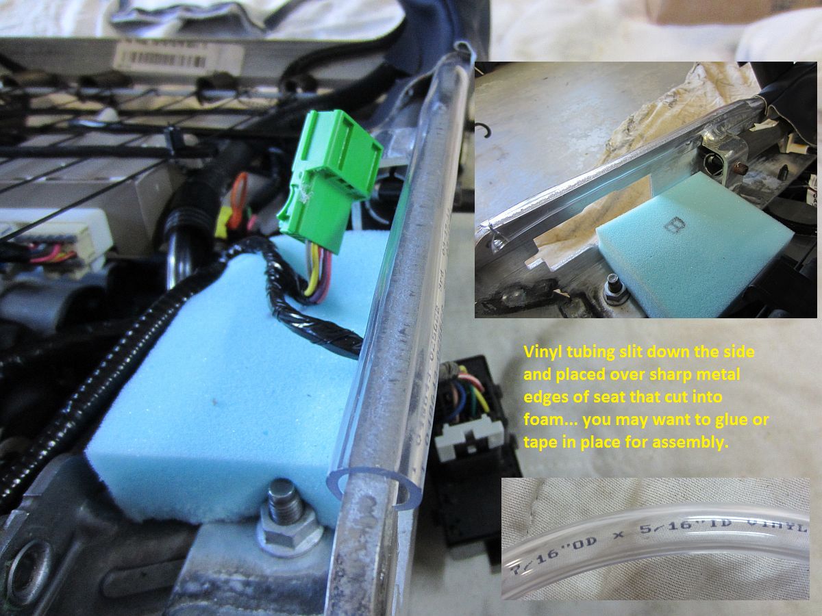 I took some additional pics below during my installation to supplement the provided black and white printout and above DIY guides. I also changed a few things in addition to doing both driver and passenger seats: the two metal risers that cut into the OE foam seat were covered with a small piece of vinyl tubing (smaller than the prior GS installation) cut down one side so that they would slip over, and rather than remove the seat switch I just unplugged it after removing the plastic cover and metal plate. Seats feel WAY better now, more supportive and firm....Actually makes the seats tolerable.