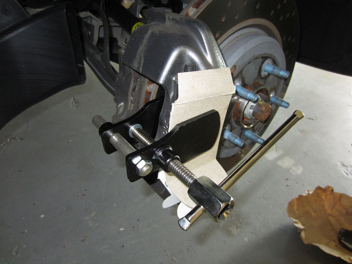 To R&R the pads I decided to get the caliper piston compression tool from Mid America Motorworks, this was easy to use with no worries about marring the caliper powder coat- used an old oil filter box to pad the caliper.