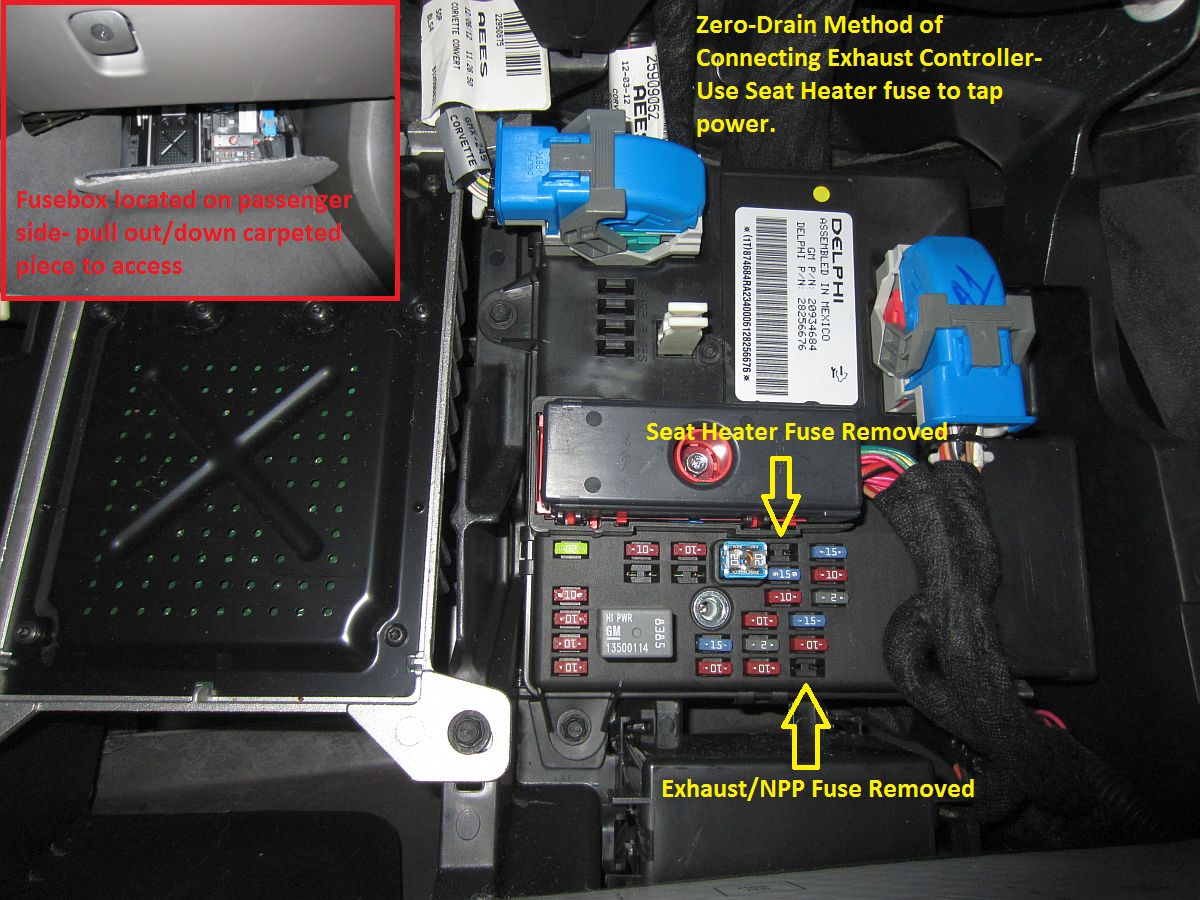 I wanted and was looking for a way to manually control the NPP exhaust and found Exterminator's DIY on Corvette Valley (PDF version archived HERE) that showed how to build and install a NPP exhaust remote control. The way he has wired his, it will remember the on/off position but has a little battery drain- even when turned off before turning the car off to minimize this. I wired mine a little differently using the zero battery drain method and an add-a-fuse tap, one caveat is that it does not remember the on/off position last set but always defaults to off/loud when the car is started- perfect for me. Instead of taking power from the NPP fuse this method required using the seat heater fuse to tap into 12v+.