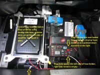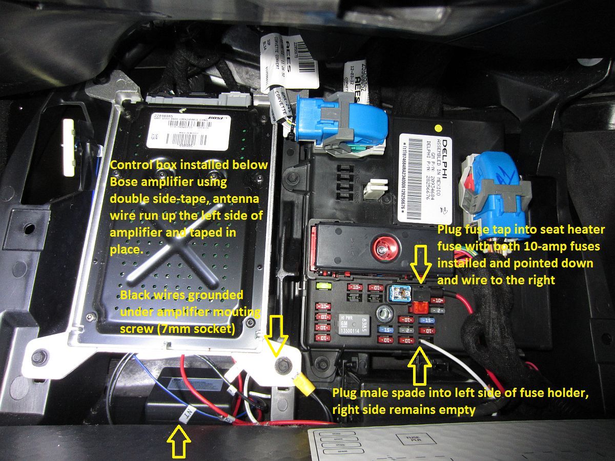DIY version works great and only costs ~$25 in parts from Amazon: (1) Add-a-fuse power tap and (1) Logisys RM02 12V 15AMP Relay Kit with Two Remote Controls. Access the fusebox by gently pulling down the carpeted panel under the floor mat on the passenger side of the car, remove both 10-amp fuses from the seat heater and NPP exhaust valve fuse locations in the fusebox, plug both 10-amp fuses into the add-a-fuse sockets, connect the add-a-fuse red power wire to the remote control box red wire using the crimp connector (I also used heat shrink tubing over mine once crimped), the black ground wires from the remote control box are twisted together and grounded using the screw for the amplifier mount, white wire is attached to a male spade and plugged into the left side of the fuse holder (right side remains unused), box is tucked below amplifier (or double side taped), and blue antenna wire is run up the left side of the amplifier. Pics of my installation below: