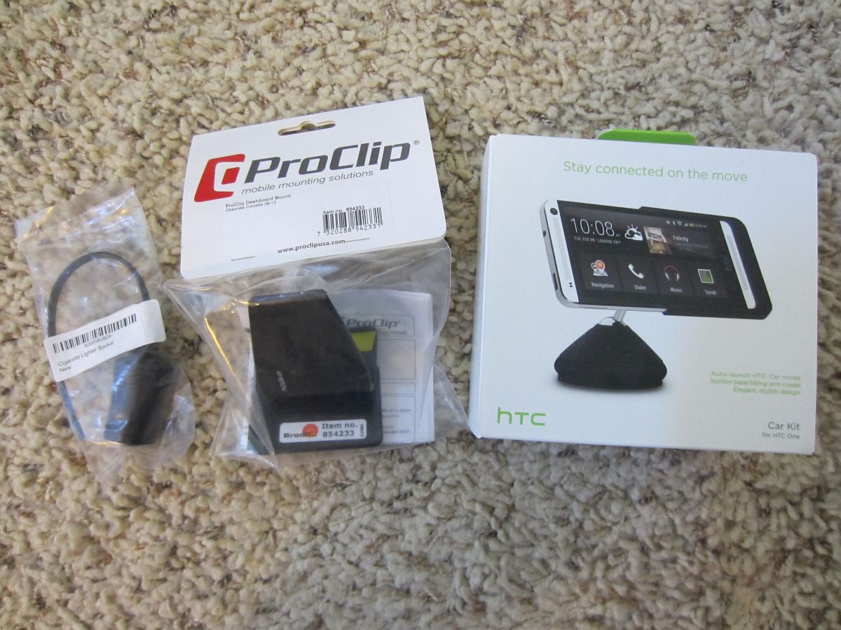 ProClip mount installed to be used in tandem with an HTC One phone dock (PDF installation instructions archived HERE). Ground and ignition 12v+ sourced at same locations as above remote exhaust control. I find that sometimes the dock needs to be modifed a bit to sit flat on the mounting surface, a little sanding and overnight curing for the E6000 adhesive and the dock is solidly mounted (but can be removed from the mount when the need to update the dock for a new phone arises- I LOVE E6000).