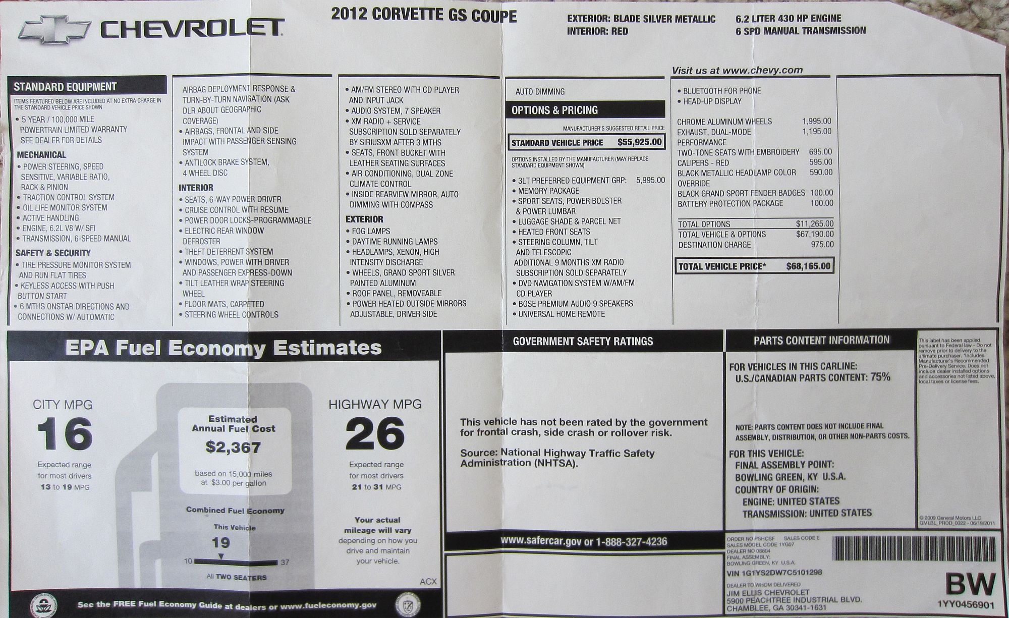 This 2012 Corvette Grand Sport (3LT) was purchased from Fred Gamble at Jim Ellis Chevrolet. This car was initially purchased by the dealership to use for dealership promotions and was sold to me as a pre-owned car with ~700 miles on the odometer with the remaining factory warranty plus the CPO warranty/service plan. Fred and the Jim Ellis sales staff were great to work with and I would not hesitate to recommend them to anyone looking for a Corvette.
