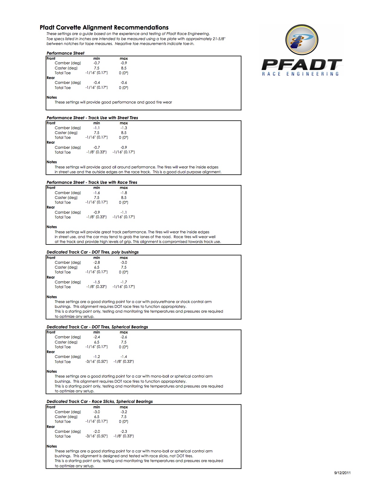 Pfadt Corvette Alignment Guide and Corvette Camber Alignment Settings