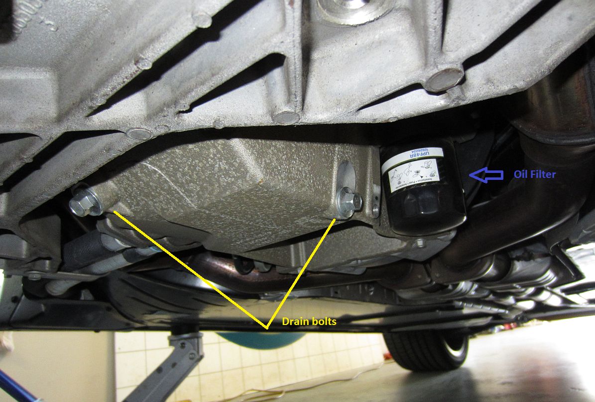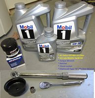 Tools: At a minimum you need a ratchet with 15mm socket or wrench and oil drain pan, optional is a torque wrench which I like to use since it is EASY to strip an aluminum oil pan (spec is 18 ft/lbs torque) and a filter cap wrench, the Pennzoil type D wrench I purchased for another car works for this car as well.
