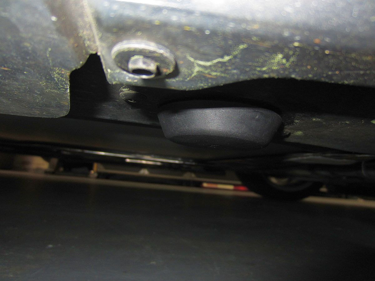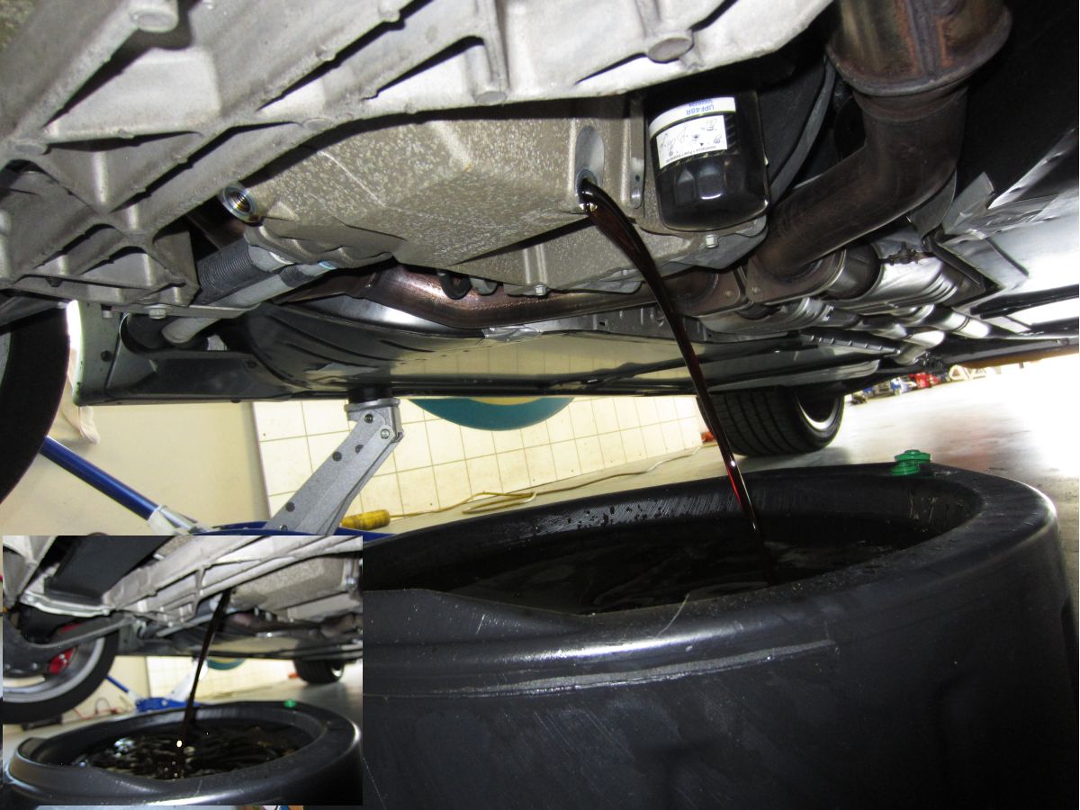After taking the car for an oil warm-up drive, I jacked the car up on both sides and placed ramps under the tires but left the jacks in position. With plenty of room to work I removed the front drain bolt using the 15mm socket/ratchet and let it drain until it was down to a trickle and then carefully maneuvered the drain pan into position to catch that trickle and the new stream from the second/side drain bolt. I waited until both were done dripping and then reinstalled the bolts and torqued to 18 ft/lb.