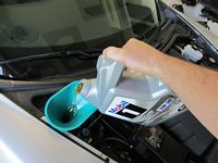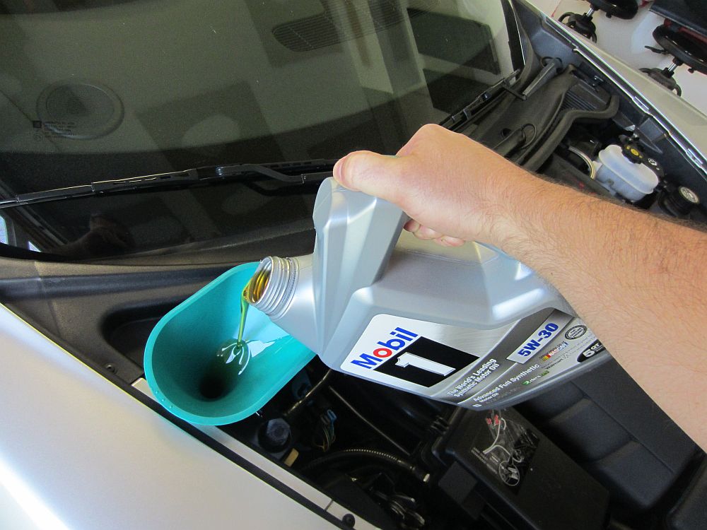 With the car back on the ground, I placed a funnel in the reservoir and began to slowly pour the oil in until a total of 10.5 qts was used, including the oil in the filter.