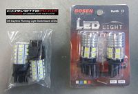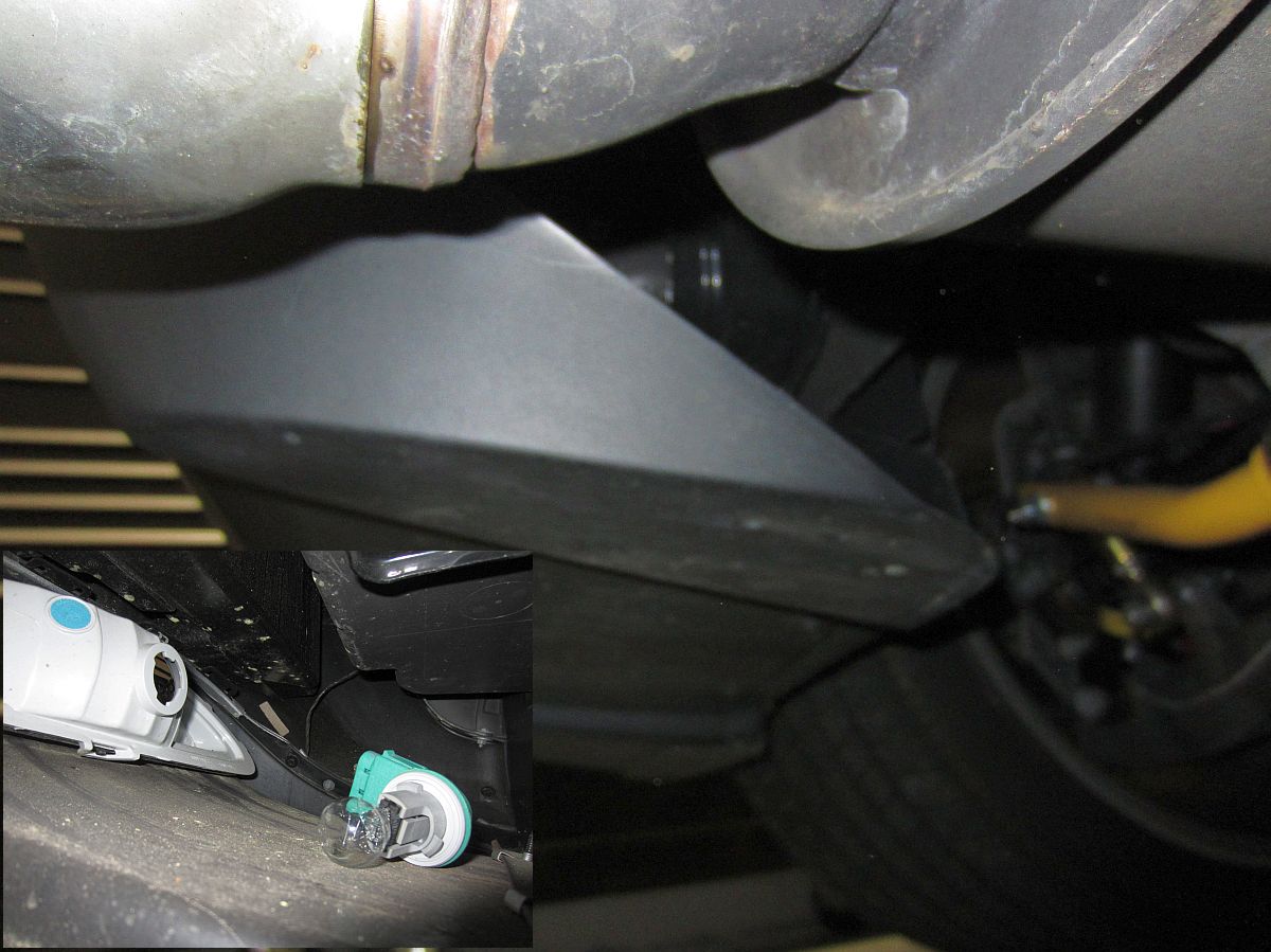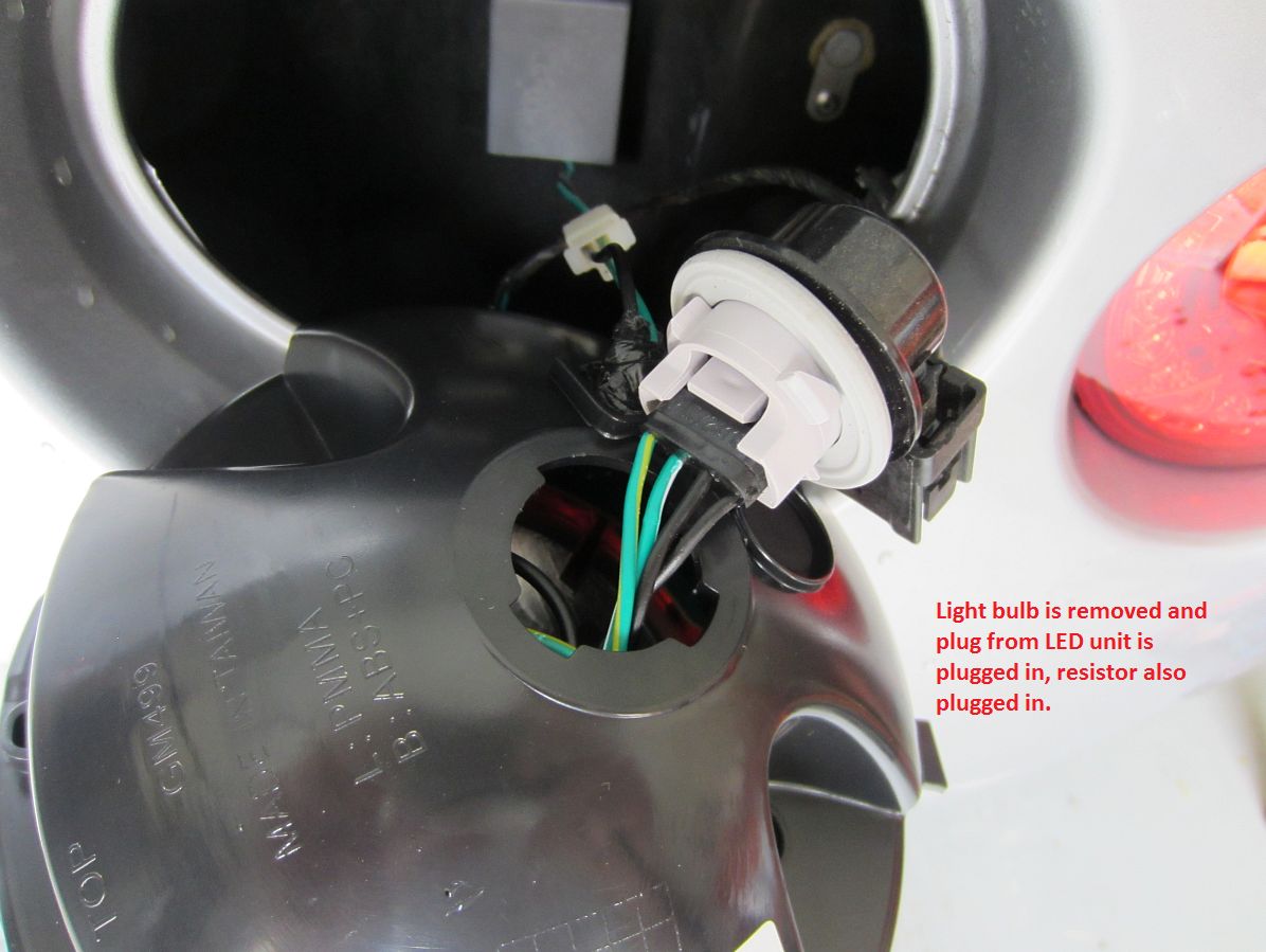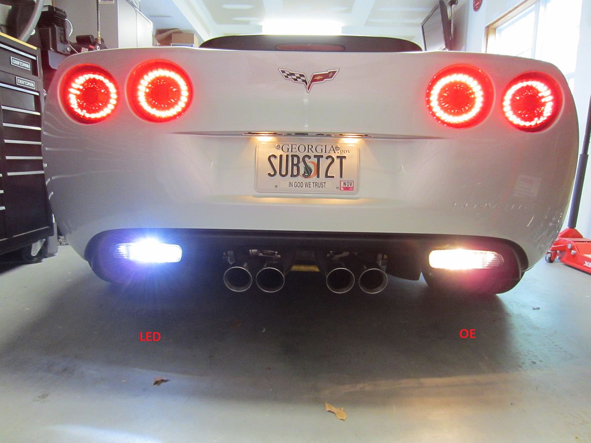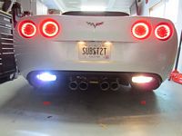 New LED 3157/3156 reverse bulbs purchased from a-integrics on eBay. Hard to see in the photos since the camera adjusted for the difference in light but these are brighter. Easily swapped out by lying on your back under the car, reaching over the plastic diffuser, locating and twisting the bulb socket out of the housing, removing/replacing the bulb by feel- just pull out to remove and push in until it clicks to install.