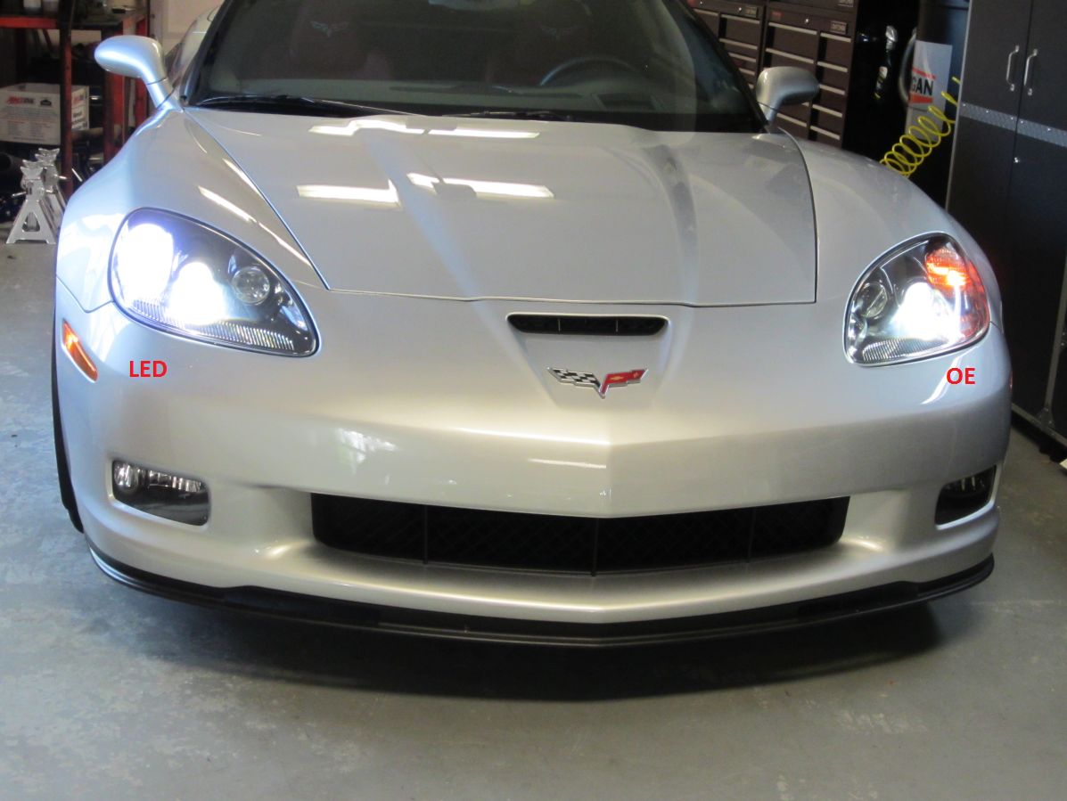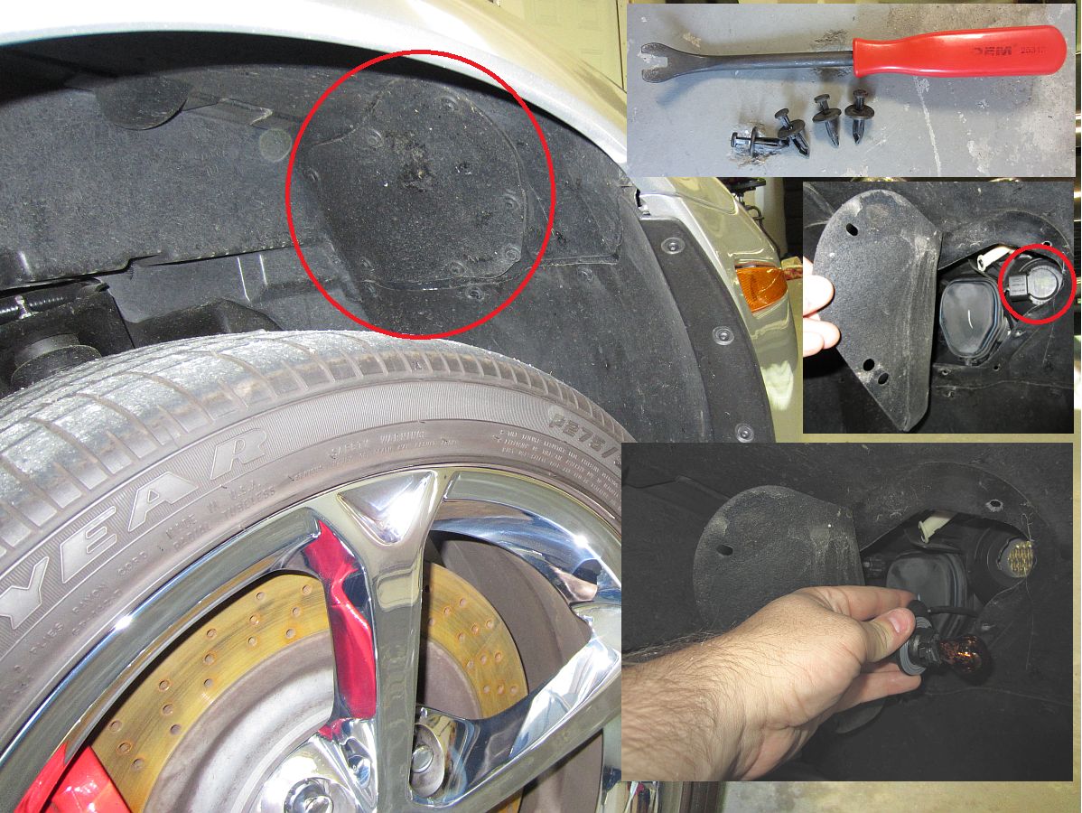 Also bought some daytime running light switchback LED bulbs from CorvetteMods, installation instructions HERE. I used a jack to slightly raise the car up and then the access panel was easy to get to without removing the wheel. Only 3 or 4 push pin plastic rivets need to be removed, the access panel is flexible rubber and will move far enough out of the way to access the plug- it is the one closest to the outside of the car. Another twist to remove socket and R&R by pulling and pushing until audible click at the base of the bulb.