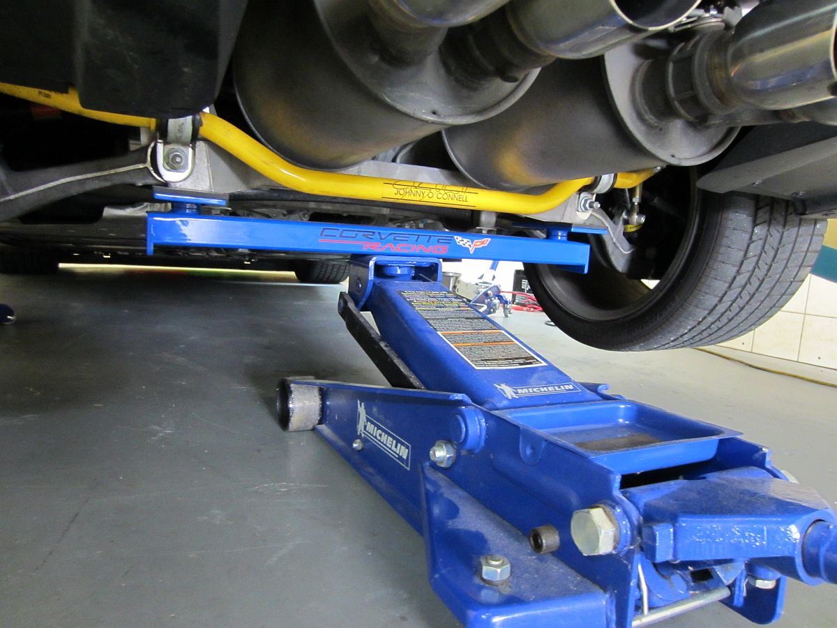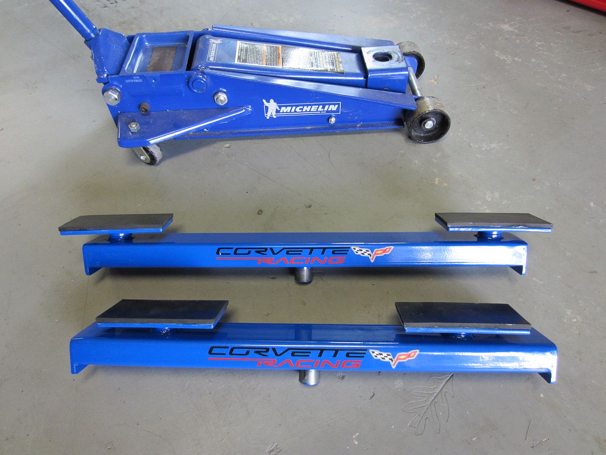 The generic cross beam adapters were not as good of a deal as when Northern was closing them out years ago and I'm not a fan of 2x6 supporting a car I am under. While looking for cross brace adapters I found some Corvette specific adapters for a C5 and emailed Jim at Smith Fabrication to see if he made them for a C6. He did not so after a few days of taking pictures, measurements, and emailing back and forth Jim came up with measurements we agreed on and he manufactured my set and sent them off to the powdercoater. The pads on either side of the adapter swivel to make the best use of the pad and can be removed for storage.