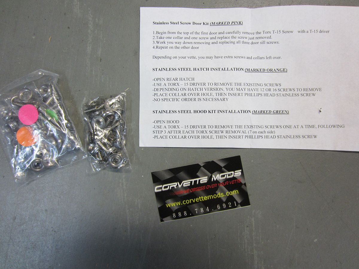 I purchased the CorvetteMods Stainless Steel Screw Kit to replace the screws in the hatch, doors, engine bay, gas cap, license plate, and fender liners (have not done those yet). They do look nicer than the OE hardware which appeared to have started rusting - crisis averted.....
