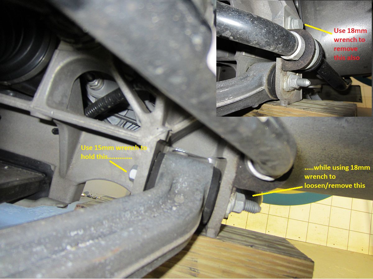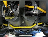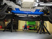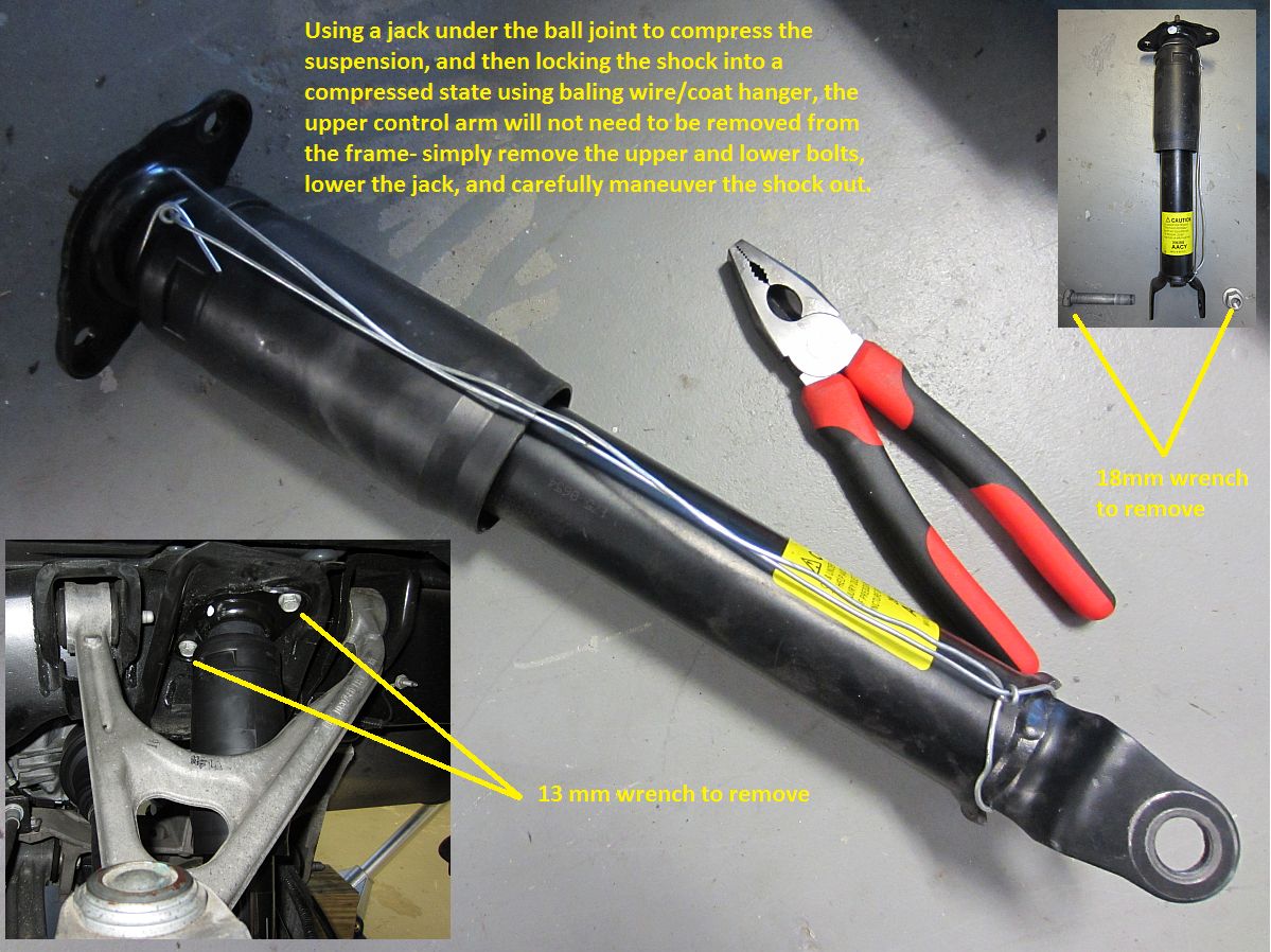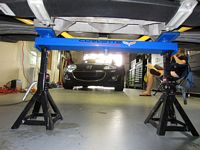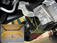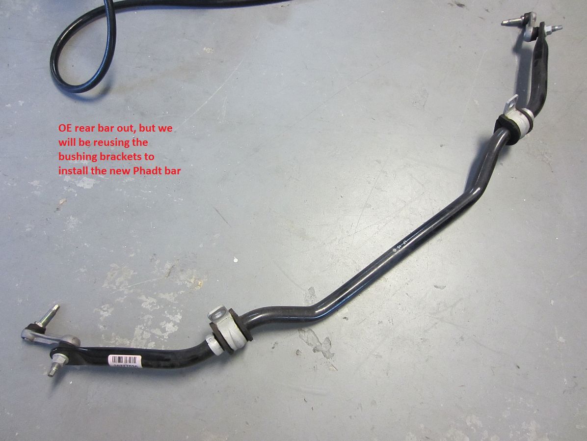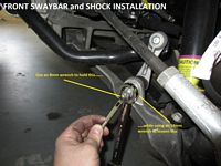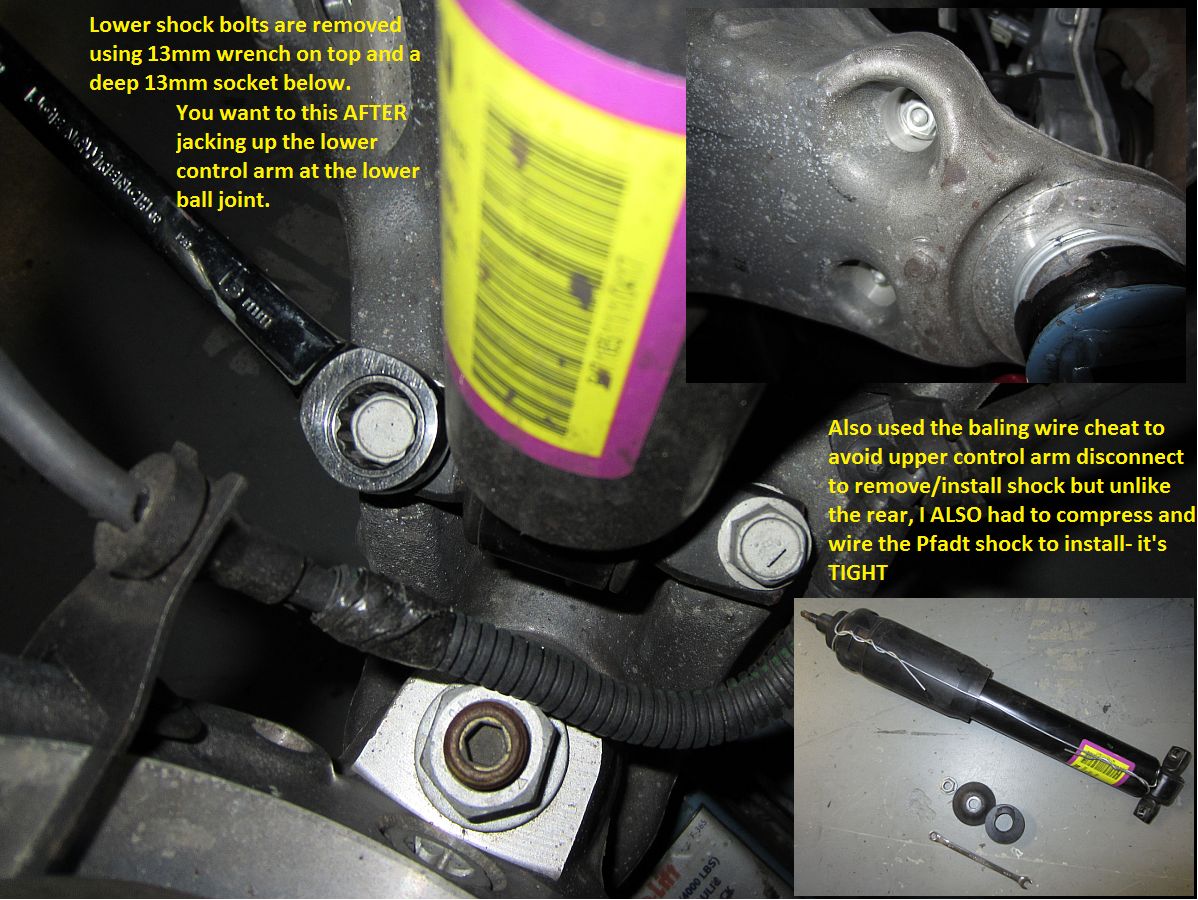 I started at the rear since it was easier to get to in the garage at the time; removed the sway bar first, then the shocks (using the wired compression shortcut), and installed in reverse order- same process used up front next. The Pfadt shocks installed without compression in the rear, but required compression/wiring for the front- saved a little bit of time not having to touch the upper control arm. As a bonus it seems to be less work entering/exiting the driveway without hearing the scrape of the spoiler.