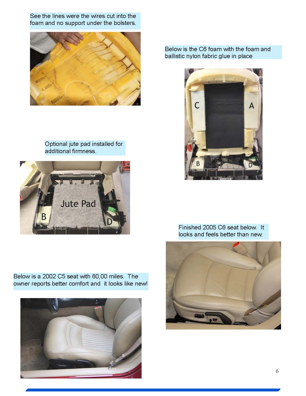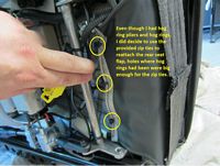I took some pics below during my installation to supplement the provided black and white printout. I did add one small thing: the two metal risers that cut into the OE foam seat were covered with a small piece of rubber tubing cut down one side so that they would slip over, hopefully this will reduce the occurence of future tears/wear in the foam. With less than 10k miles, my foam was already torn. Seat feels WAY better now, more supportive and firm. Really, this repair kit has made seats I was looking to replace ASAP tolerable for a while longer.