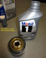 The oil filter was removed using the wrench and placed down in the drain pan. While that was dripping I filled the new oil filter with oil and then installed it hand tight. All the oil drips/runs were cleaned up and then time to move up top.