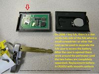 To replace the battery, the key is removed by pressing the release and pulling out. On that side of the fob there is a small slot on the side where a small screwdriver can be inserted to separate the fob case, and work around the perimeter to completely separate the halves. The battery is a CR2032 and should be one with smooth contacts, I found Energizer batteries fit the bill for me. Line everything back up (including the release button for the key) and carefully snap back together- good for another year or so.