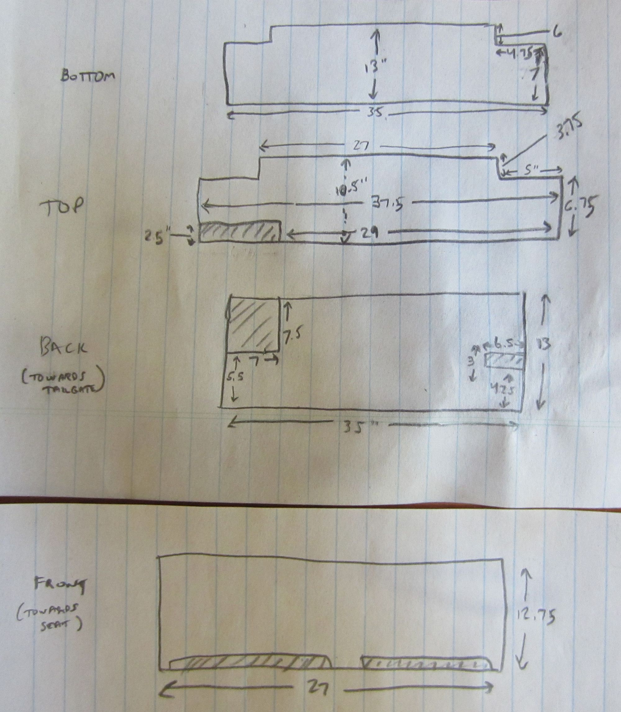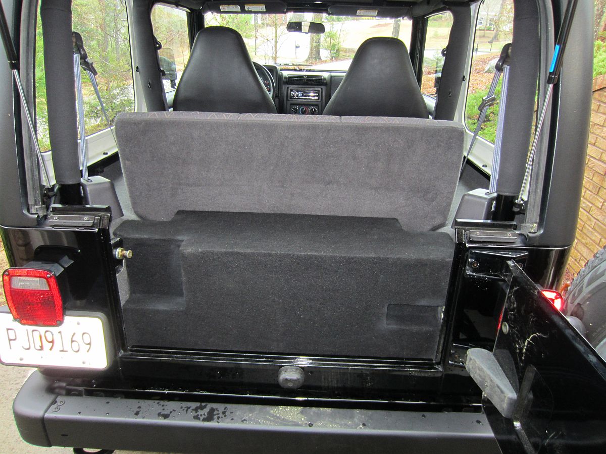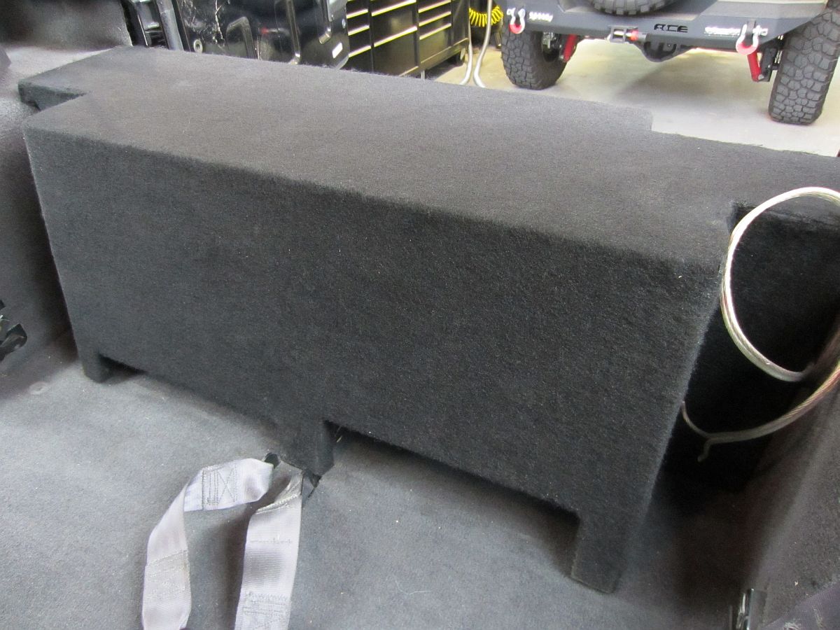 [SUB UPDATE] A recent storm came through and winds were enough to force water in the rear seals and let water in....the MDF became a sponge so box is no longer viable. Was able to take some more pics and obtain measurements, not sure we will go with a rear box next or a different sub solution....but will use Baltic Birch with bed liner sprayed inside and out next time if we do. MDF sounds great but not optimal for Jeep environment.
