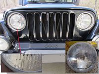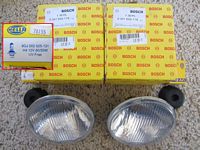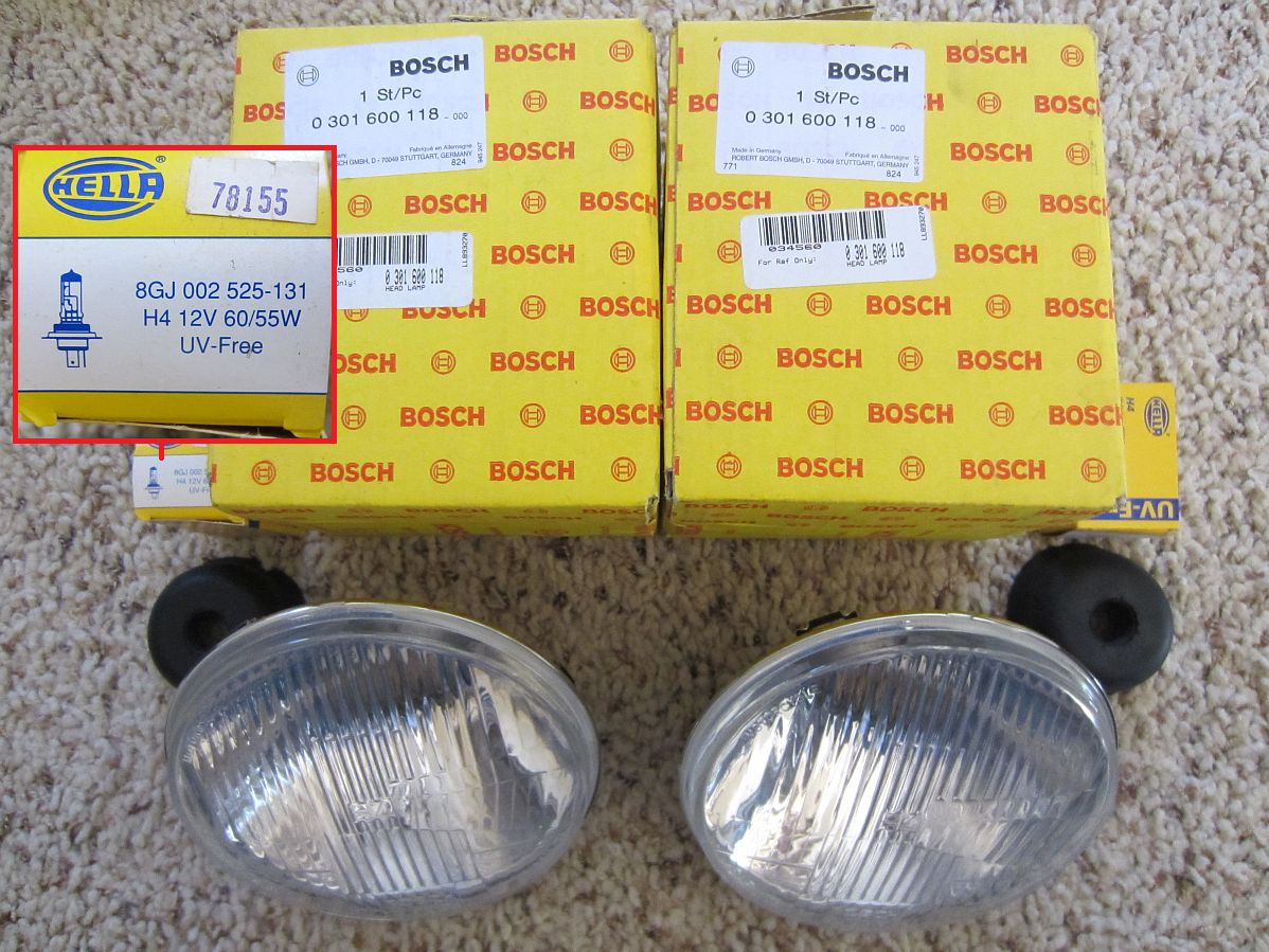 Bosch (Hella) H4 Headlights (P/N 0301600118) with 55/60W Hella bulbs replaced the mismatched Wagner/Sylvania sealed beams. These are DOT approved as shown on the headlight lens and have a much better light pattern/cutoff than the horrible sealed beams while being brighter- more light where you need it to see.