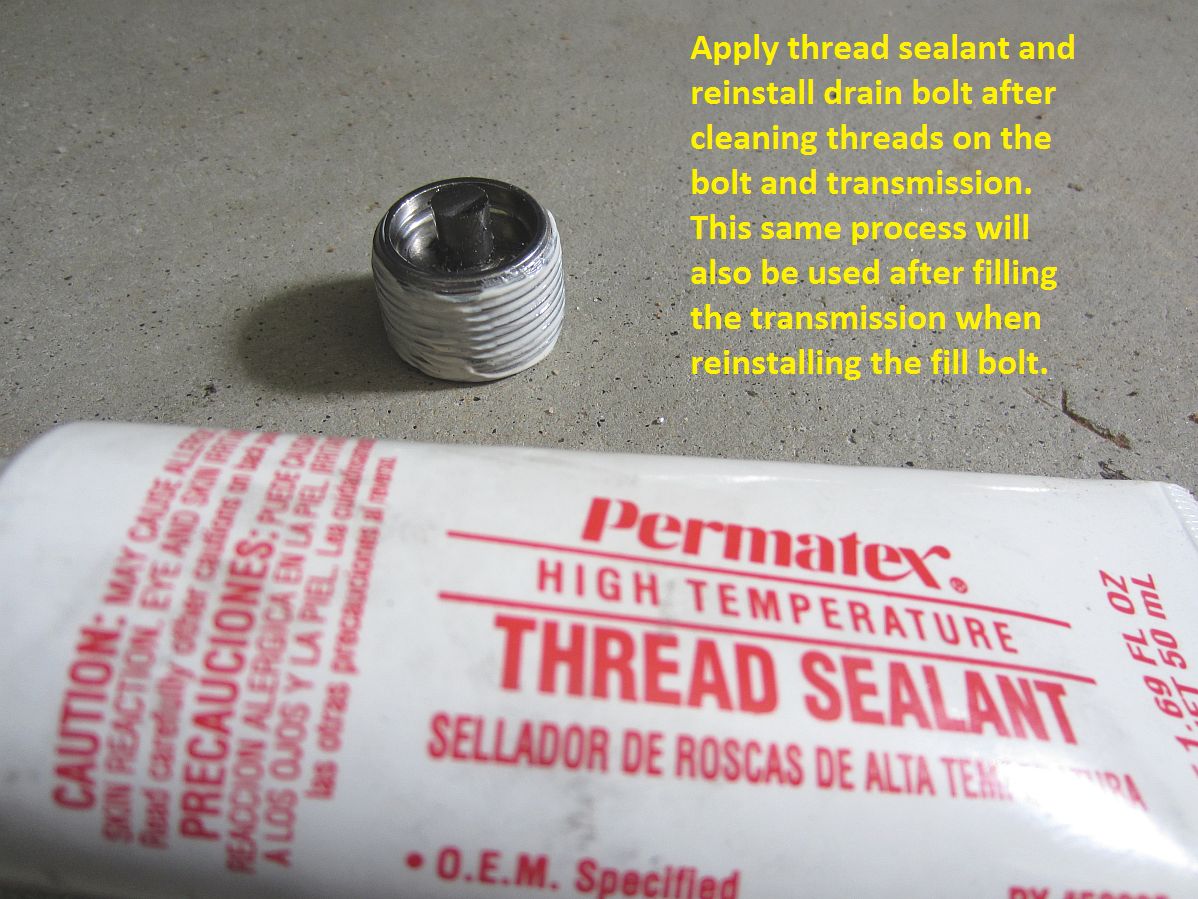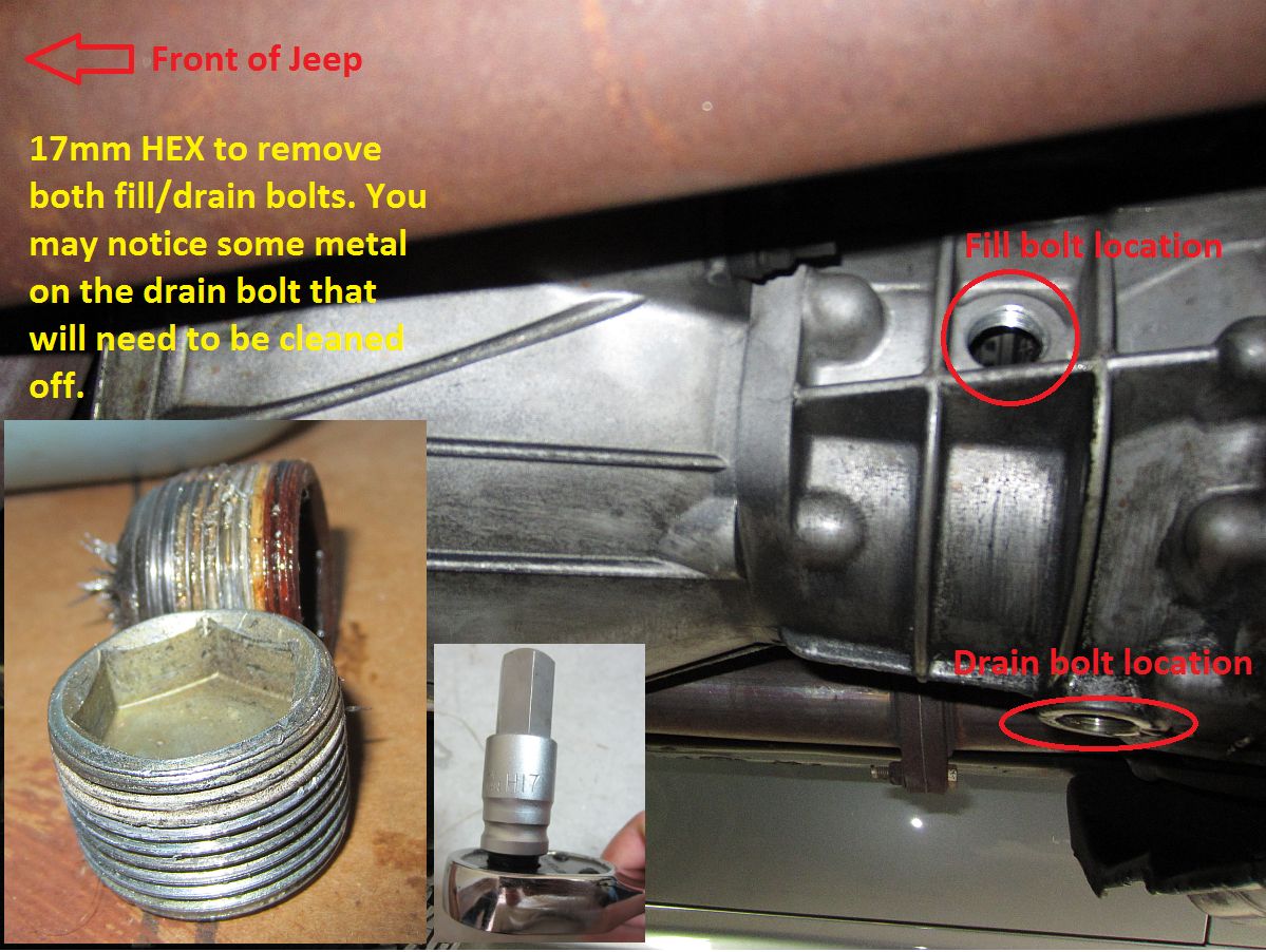 After taking the Jeep for a quick fluid warm-up drive, park on a level surface and start by placing a drain pan under the transmission and loosening/removing fill bolt (17mm HEX)- you may get a little fluid out on this step. Next remove the drain bolt (17mm HEX) and drain all fluid. After draining all fluid clean the threads on the drain bolt and transmission, apply thread sealant, reinstall drain bolt. Fill transmission through fill hole until fluid starts to dribble out, apply thread sealant to fill bolt and reinstall. DoneThe torque spec I found online was 14-20 ft-lbs so I settled on 15 ft-lbs when I reinstalled both.