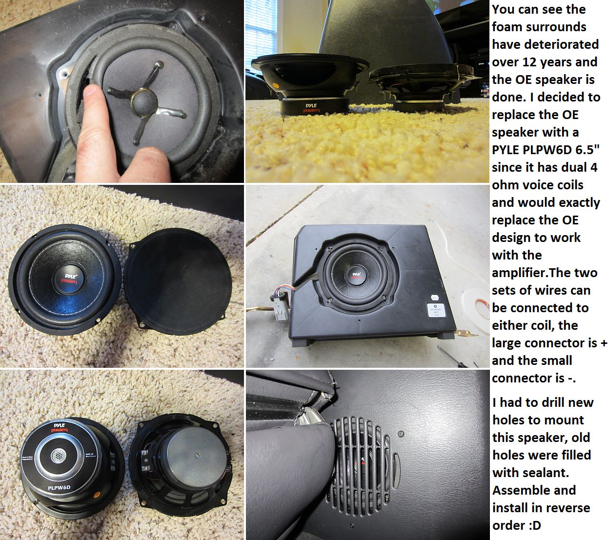 I chose the Pyle since it replaces the factory dual voice coil configuration at a cost of ~$20, although some have had success running single voice coil speakers using only one set of wires as in this forum thread HERE. The OE speaker is dual 2-ohm voice coils so with the Pyle speaker the amp power is half.....we'll see how it works before I spend $120 on a Kicker 40CWRT672. Pics below show the details (not pictured, I did add polyfil to the enclosure before installing the speaker):