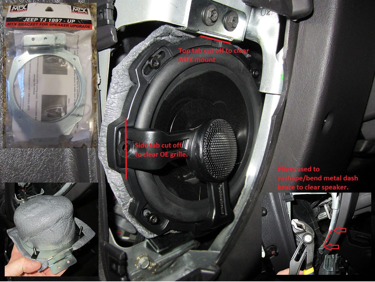 The radio was a plug and play replacement thanks to the Crutchfield Wire Harness and Mounting Kit (Mastersheet for TJ detailing radio and speaker replacement, Radio Wiring for TJ). The sound bar speakers were an easy swap as well, but the dash speakers were a bit more work- both require cutting the factory plug off and crimping new standard female spade type connectors on. The MTX adapter bracket was chosen since it angles the speaker up but that angle and the speakers I was using caused some fit interference with the dash metal brace and speaker grill. The dash metal was easily "adjusted" for clearance but the RF speakers have some added mounting tabs that had to be removed to work with the MTX bracket and to clear the grill- easily, but slowly done to avoid heat extremes, with a die grinder and cutoff wheel. The tweeter bridge of the RF Power speakers forced orientation of the speaker that turned out to be perfect angling the tweeter up and towards the center. I used foam baffles to isolate the front and rear sound waves. Sounds GREAT, next up will be subwoofer and amplifier installation.