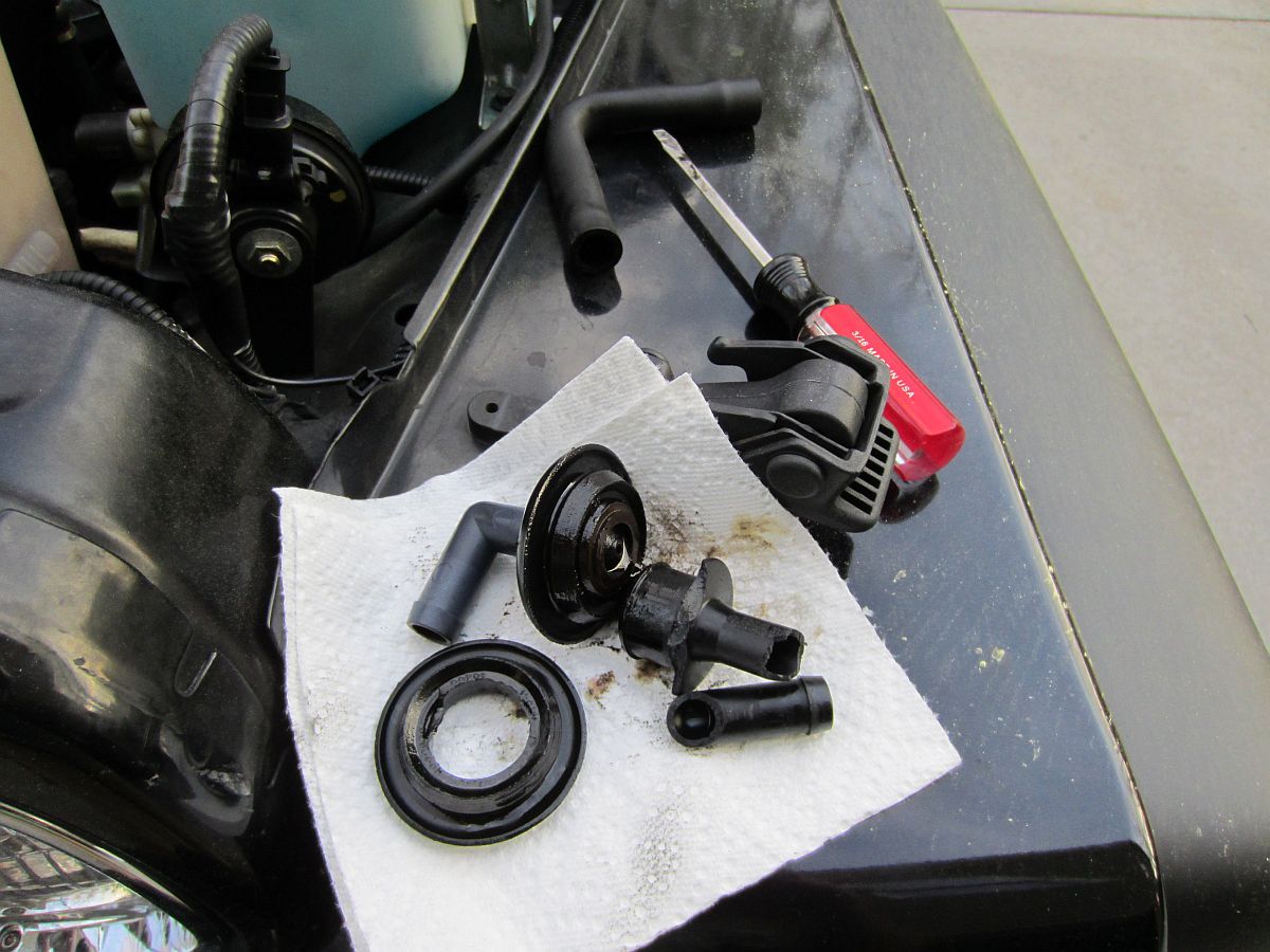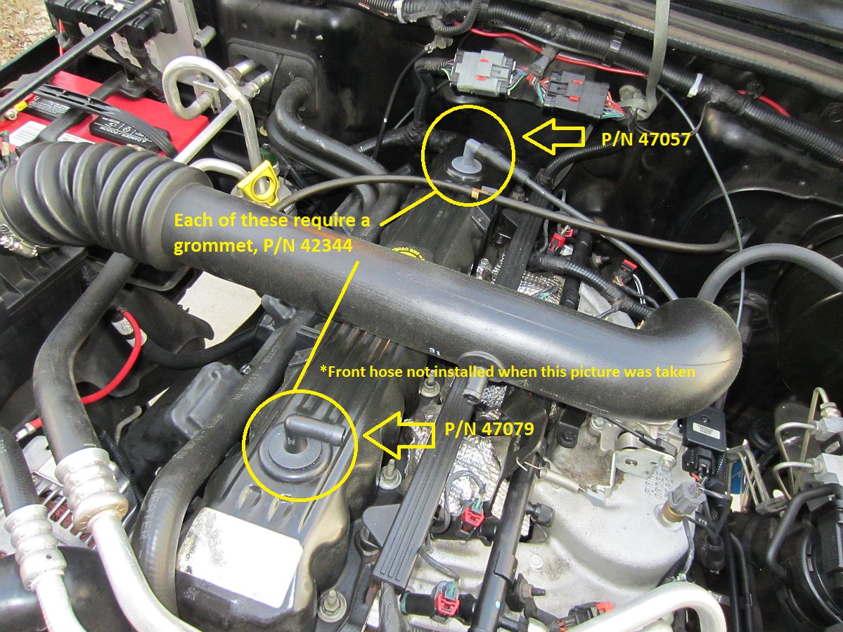 [UPDATE] Decided to get a newer head unit with Bluetooth for hands free phone calls and some newer tech/options- Alpine CDE-HD149BT (manual HERE).Still trying to resolve an oil leak so thought we would start at the top and replace the two large grommets, CCV valve (erroneously referred to as a PCV valve), and elbow. If your hoses are shot too, you might be better off getting the kit from Jeep/Mopar which includes all of it. I spent ~$15 at the local McParts stores on the Dorman HELP parts. The rubber grommets were like hard plastic and I could see where they were letting oil out so maybe this will slow or eliminate the leak. Both the valve and the elbow were pried out with a screwdriver carefully, the plastic was brittle so these were due to be replaced. I also replaced the front hose with some generic hose and the rear line had the manifold hose replaced- we'll see if I end up buying the OE factory part.
